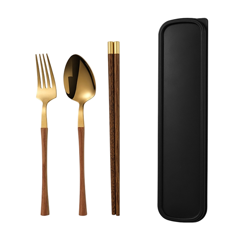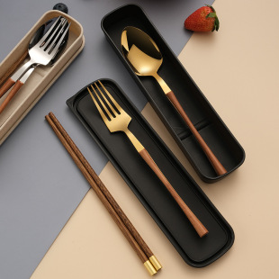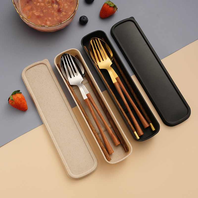 不锈钢筷子勺子套装 餐学校上班族 仿木纹餐具学生外带便携式
