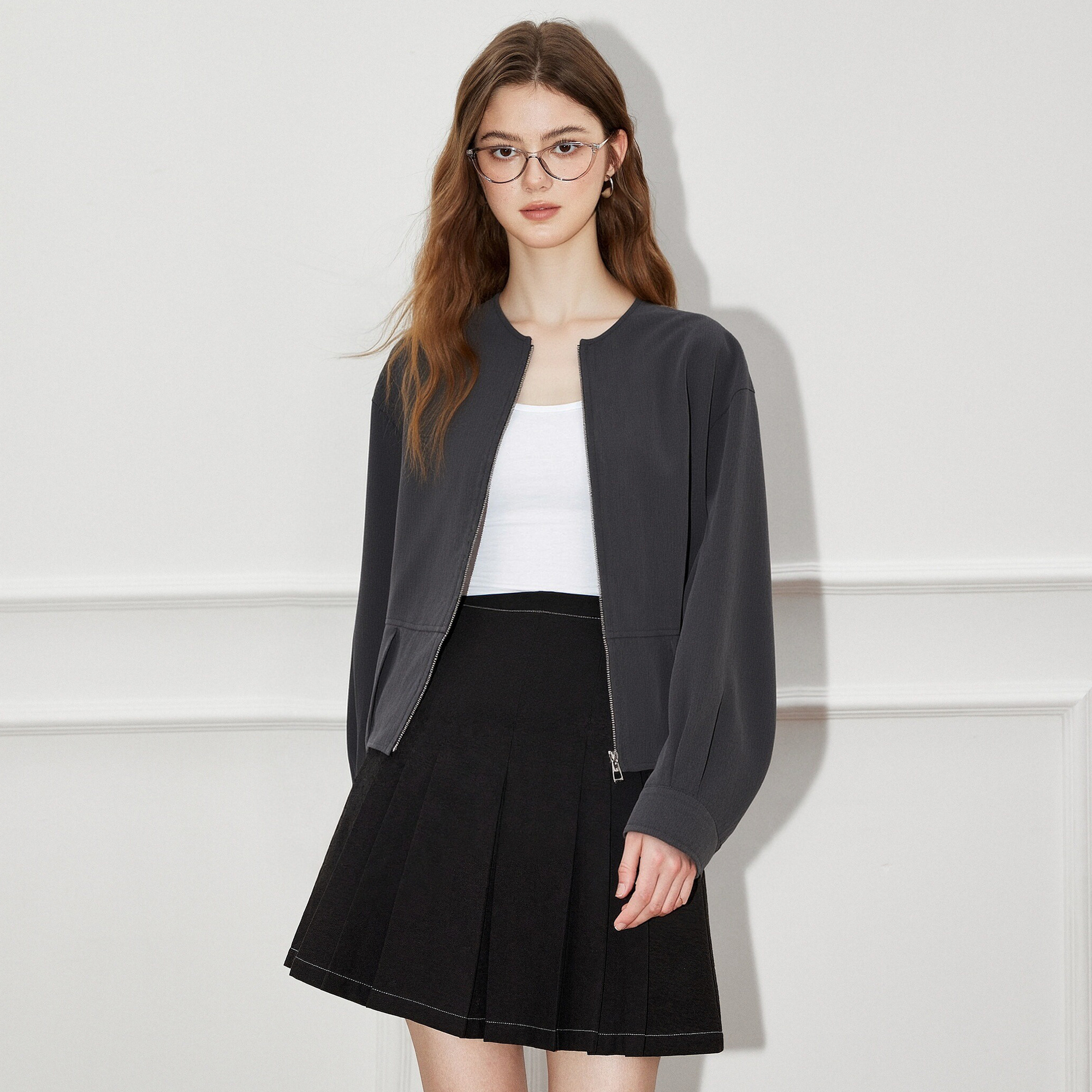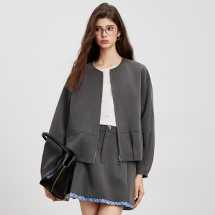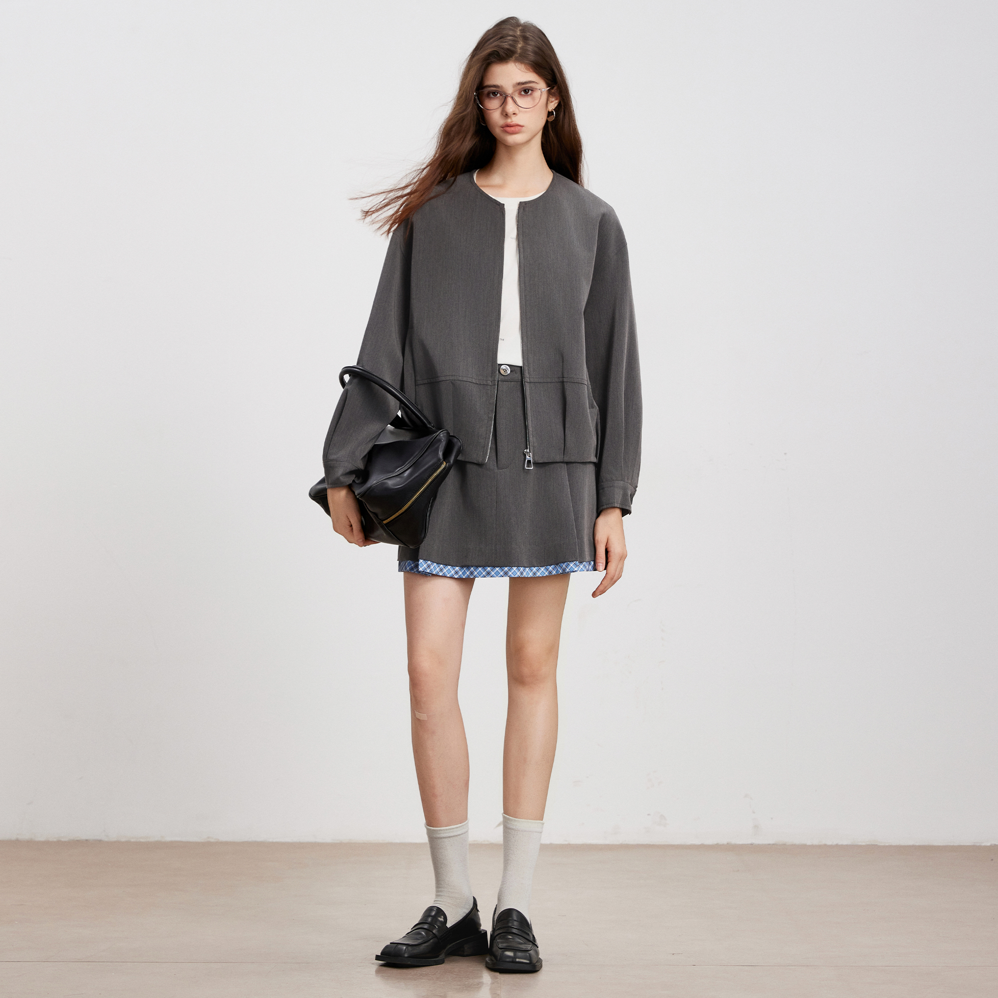 新款 百家好灰色休闲外套女2025秋季 气质圆领夹克上衣 House Basic