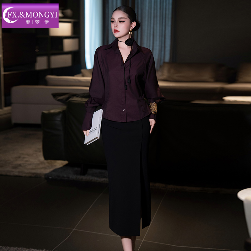 菲梦伊大方得体两件套女秋季 黑色职业半身裙子 高品质轻熟气质衬衫