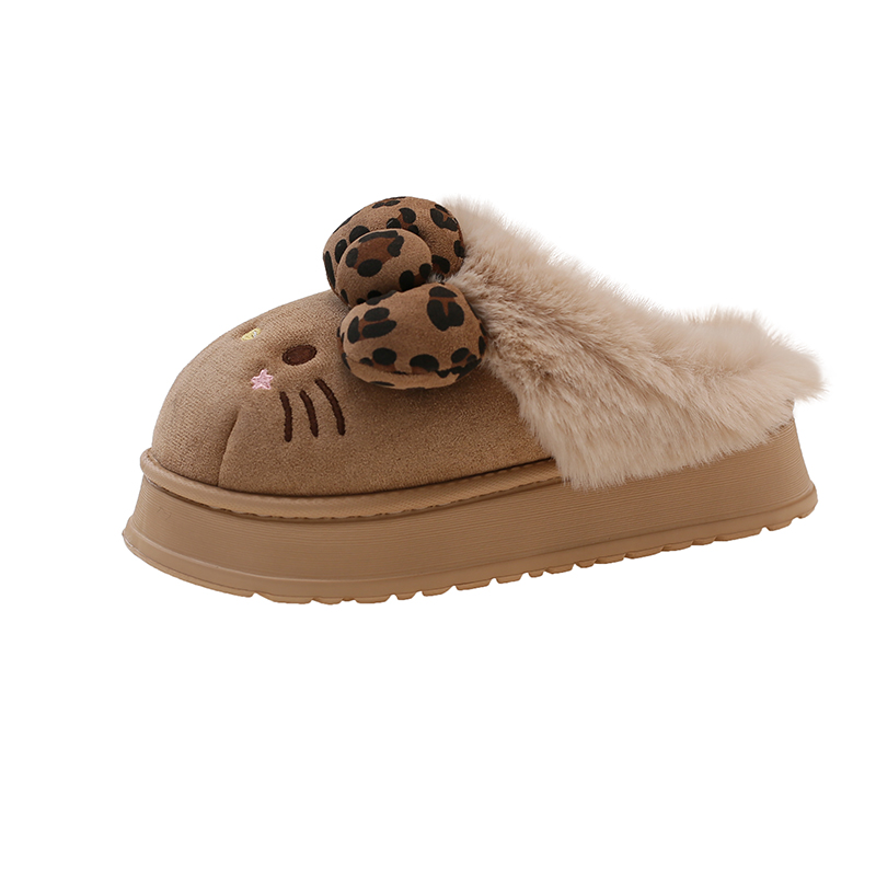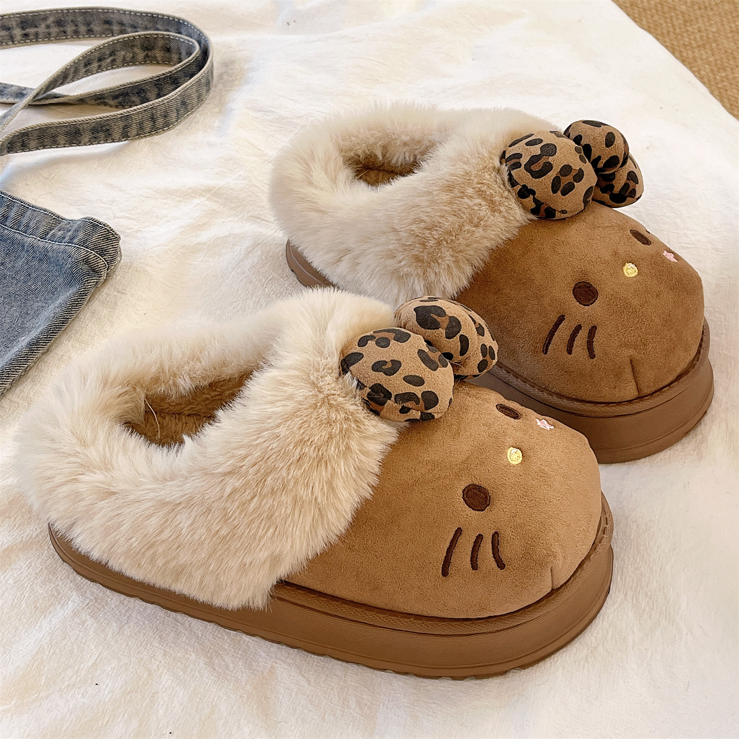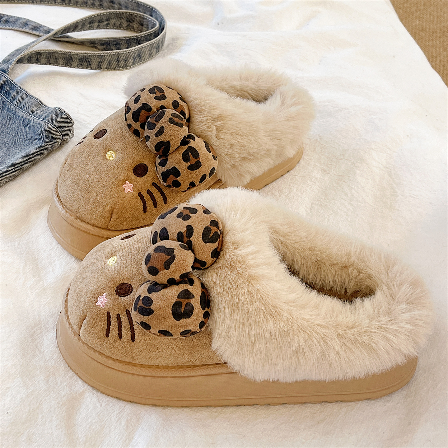 居家室内加绒保暖可爱猫咪半包跟棉拖鞋 豹纹蝴蝶结毛毛拖鞋 女冬季