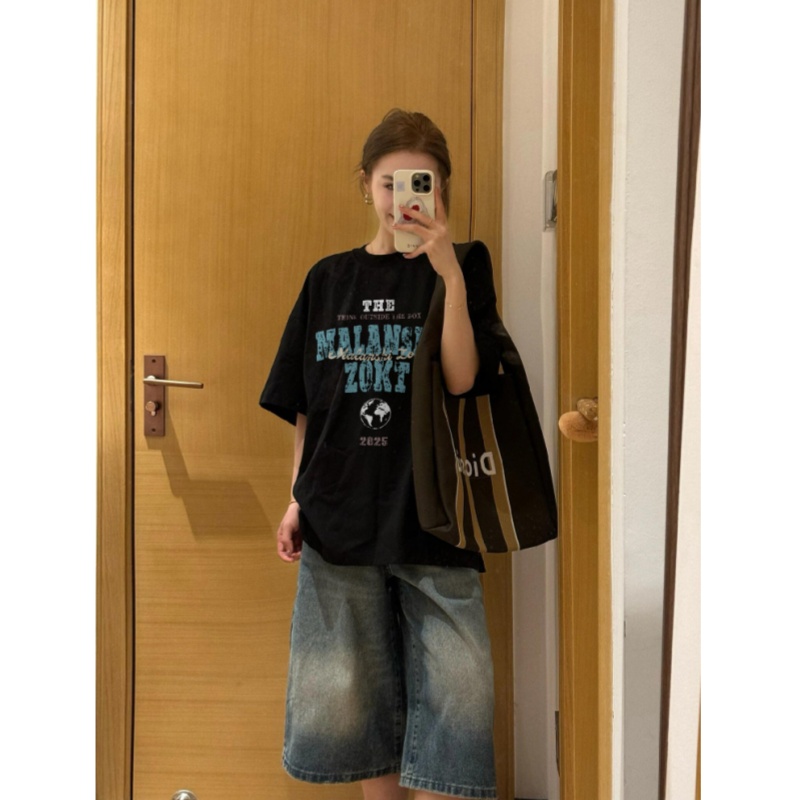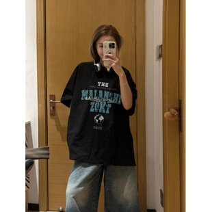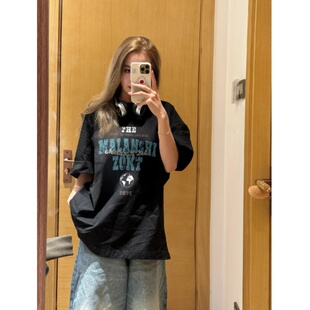 潮牌宽松设计感小众半袖 t恤女夏季 上衣 复古高街黑色短袖 纯棉美式