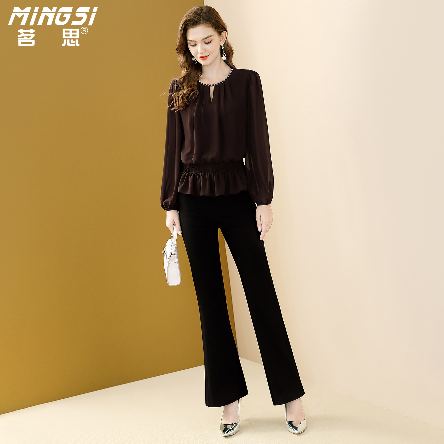新款 女2025秋装 纯色钉珠百搭显瘦上衣 衬衫 茗思气质通勤荷叶边长袖