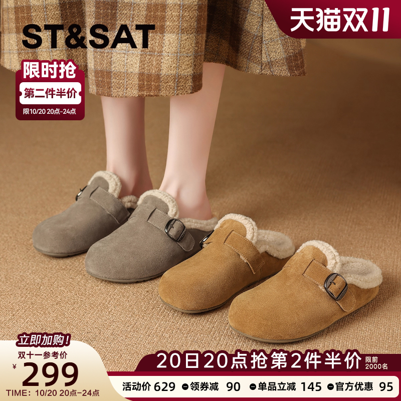 加绒一脚蹬厚底毛毛鞋 2025秋冬新款 女鞋 星期六真皮保暖毛绒勃肯鞋