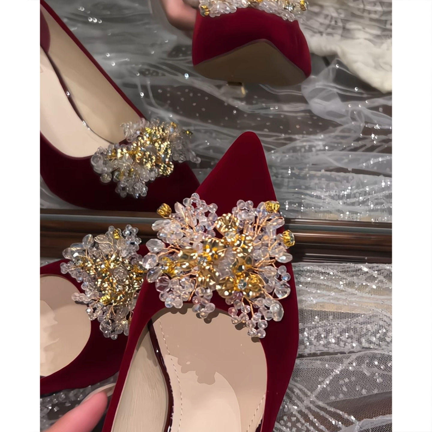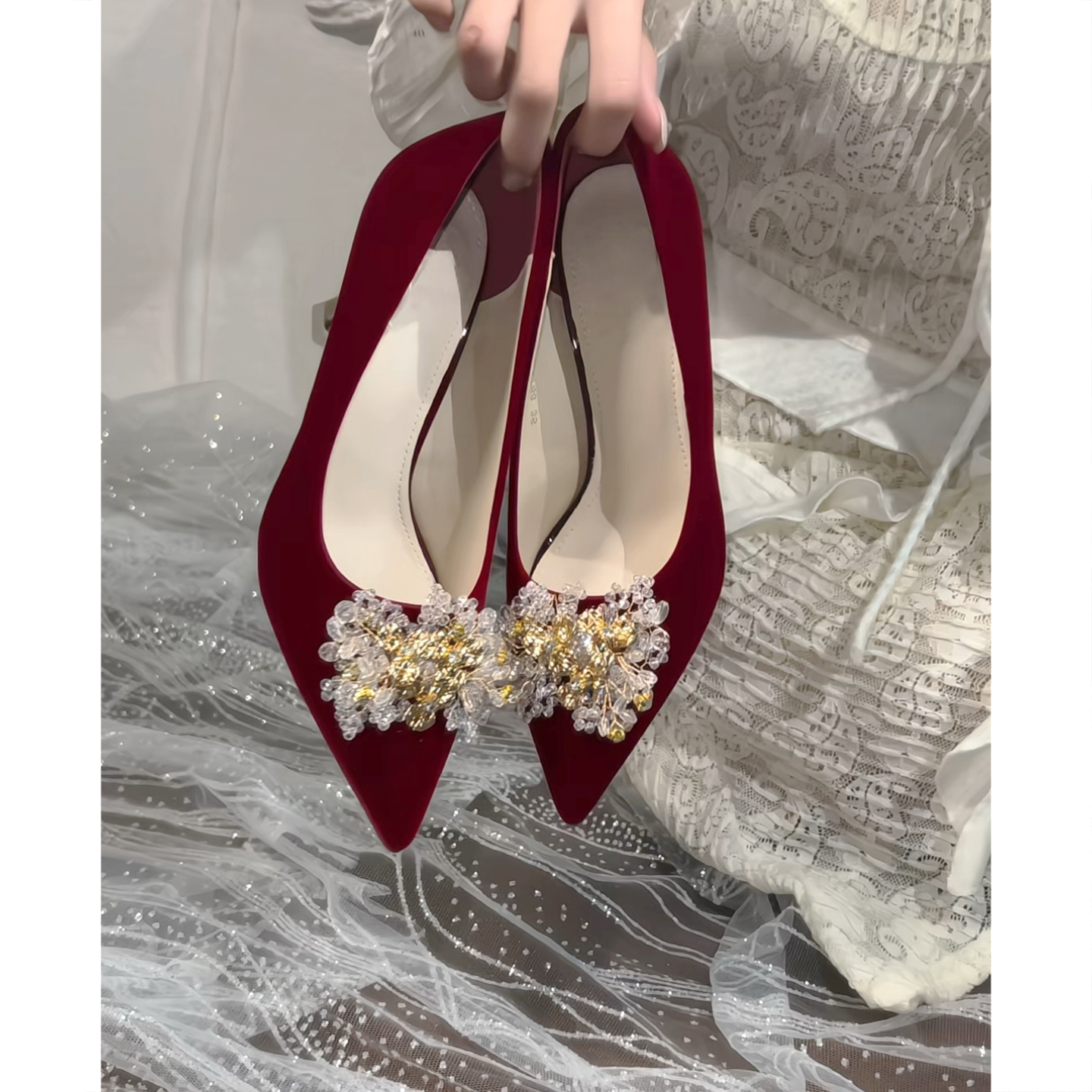 水晶蝴蝶结复古绒面尖头绝美高跟鞋 红色婚鞋 女秀禾敬酒礼服新娘鞋