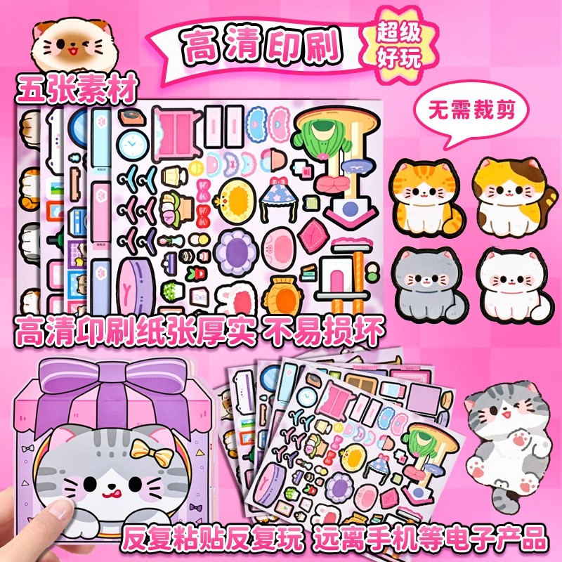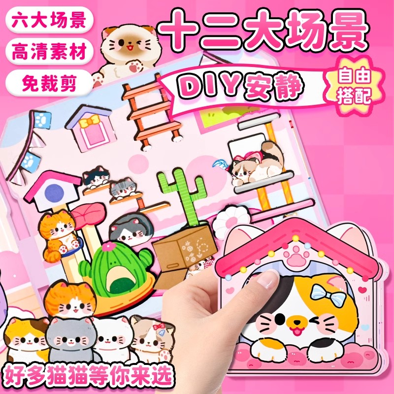 益智玩具儿童礼物 贴纸书手帐女童手工diy手账可爱卡通造景贴画2025网红爆款 猫咪安静书新款 女孩免裁剪换装