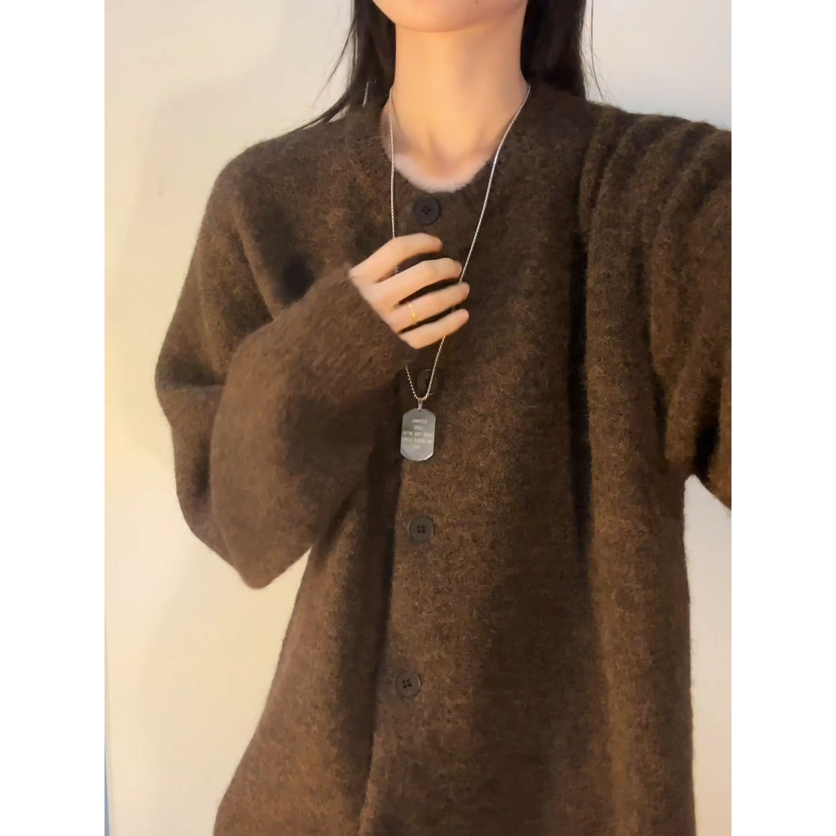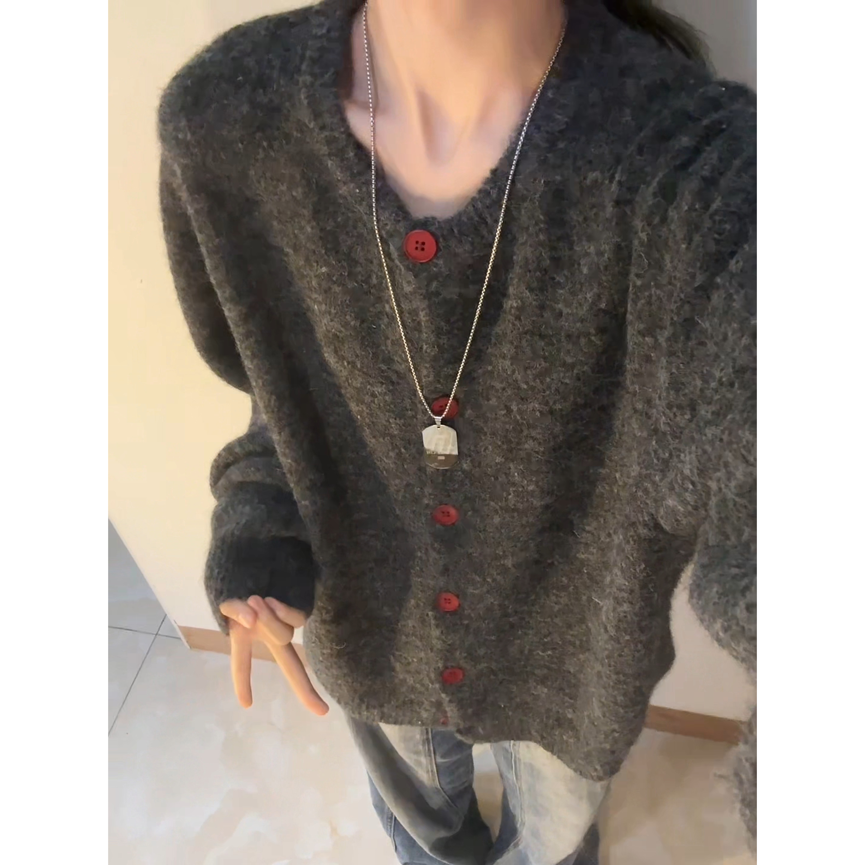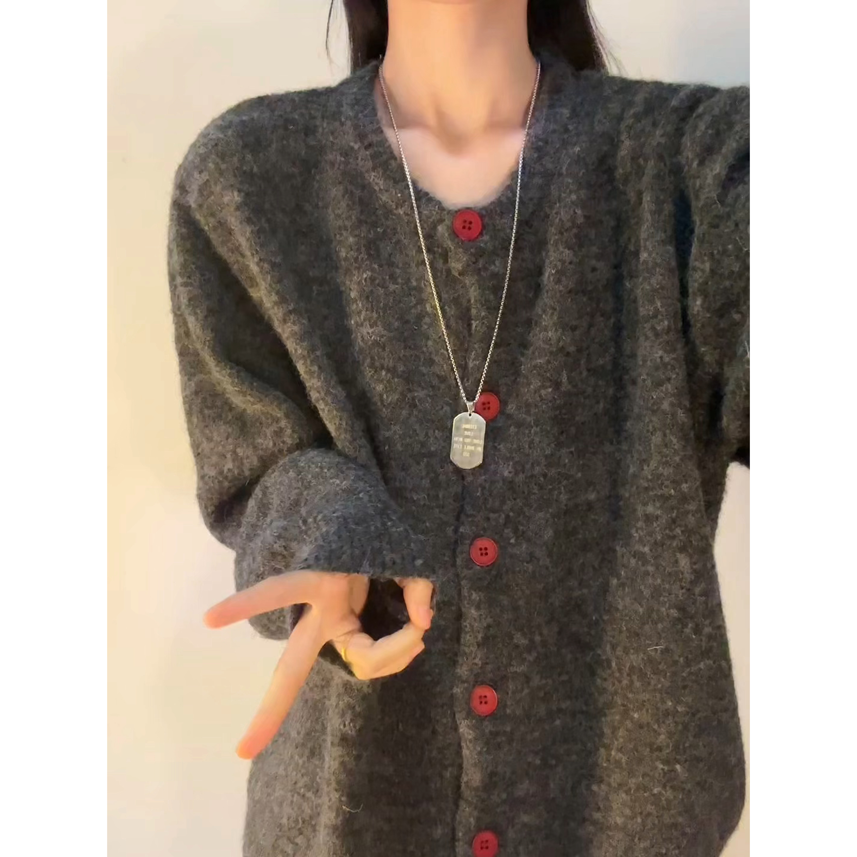 蓝色翻领毛衣 新款 阔色慵懒风灰色针织开衫 外套上衣女2025秋冬季