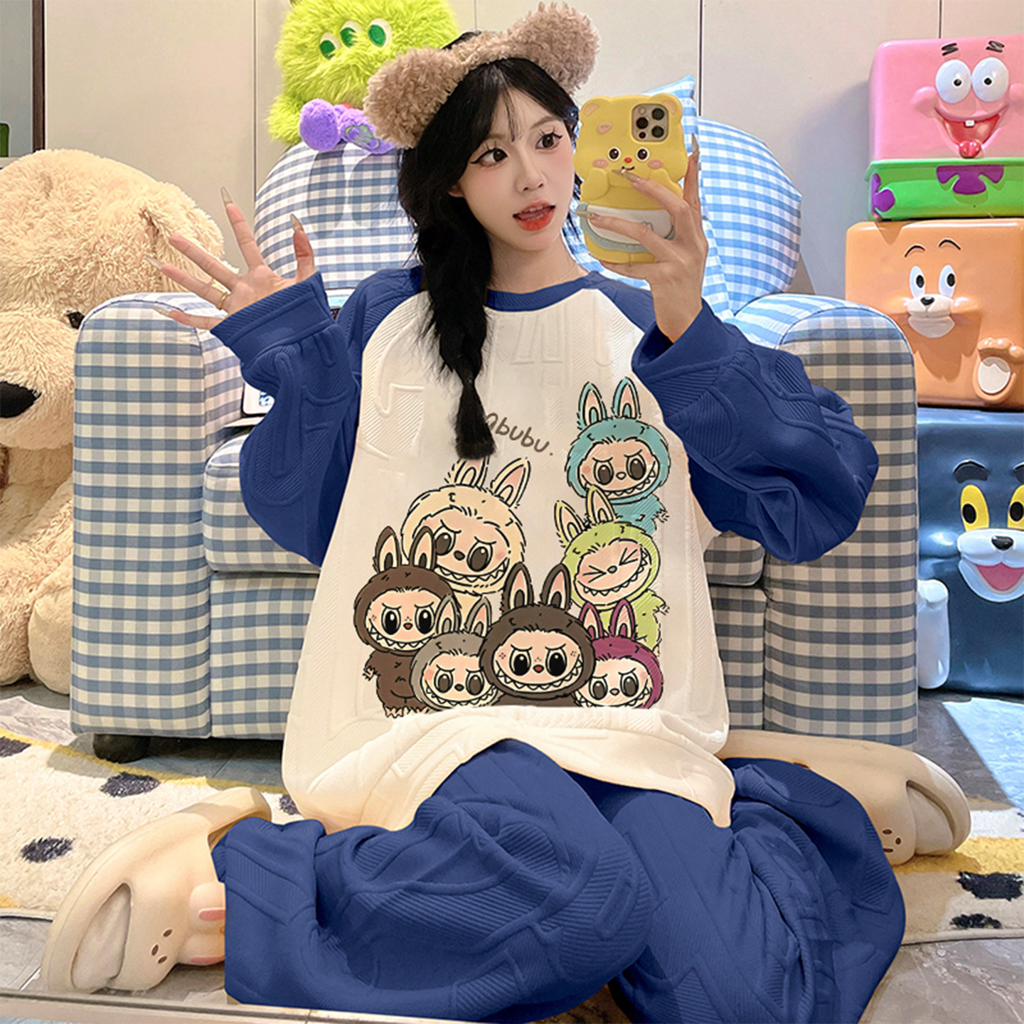 初高中学生家居服 加厚款 空气棉夹层卡通可爱拉布布睡衣女款 秋冬季