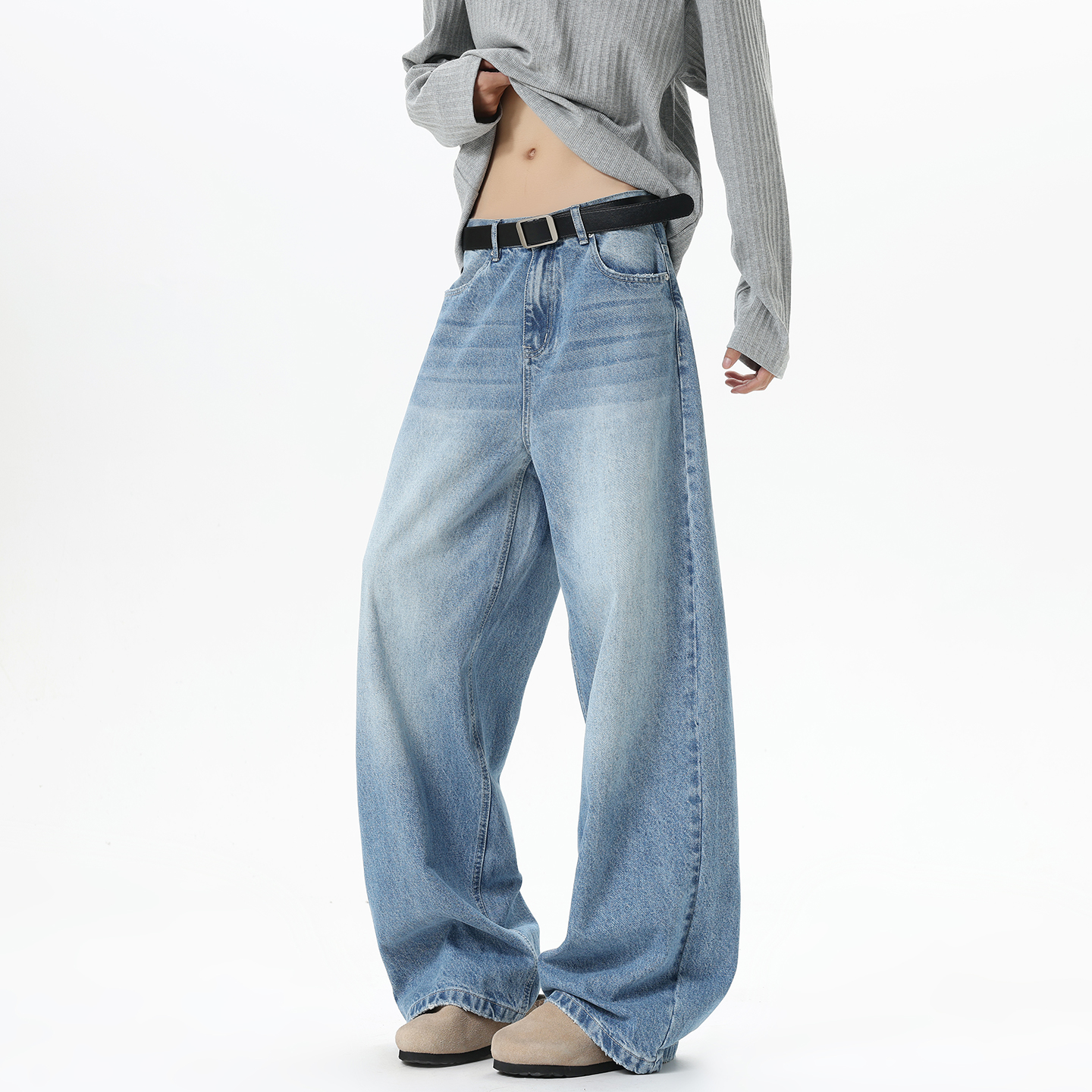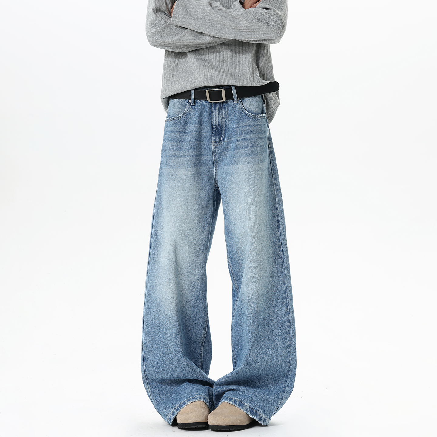 cleanfit潮牌宽松百搭阔腿弯刀长裤 男生秋季 子 水洗直筒牛仔裤 美式