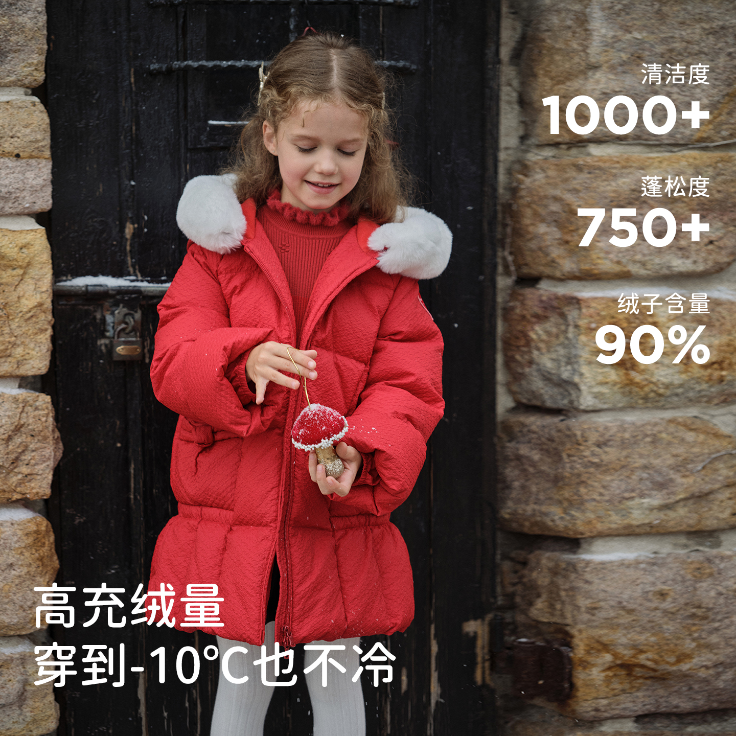 戴维贝拉中大童中长款 女童防水连帽新年红加绒外套 羽绒服2025冬装