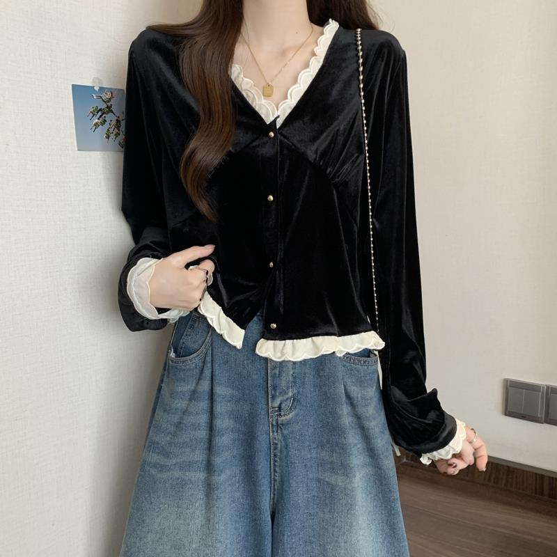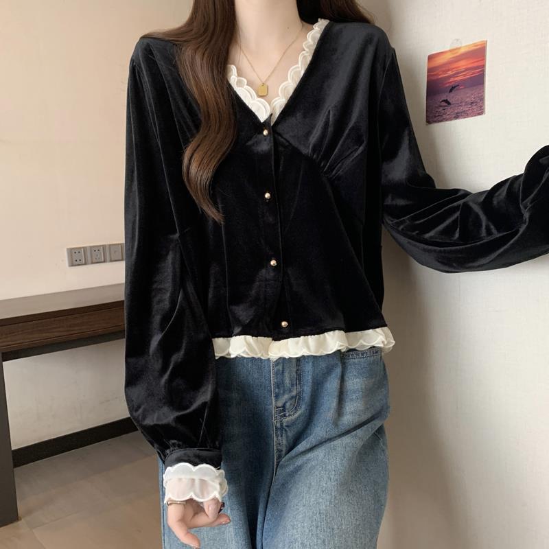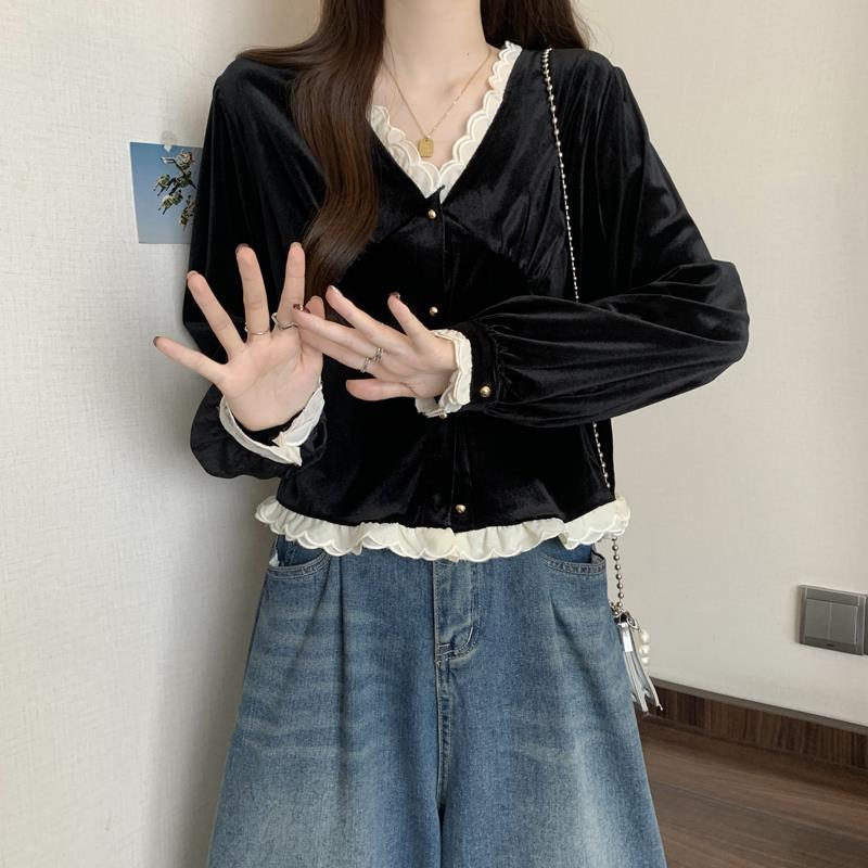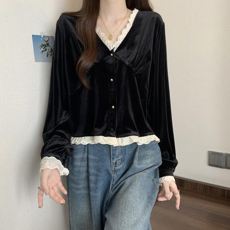 女胖mm减龄打底衫 秋冬大码 衬衫 花边拼接金丝绒长袖 1012z 微胖法式