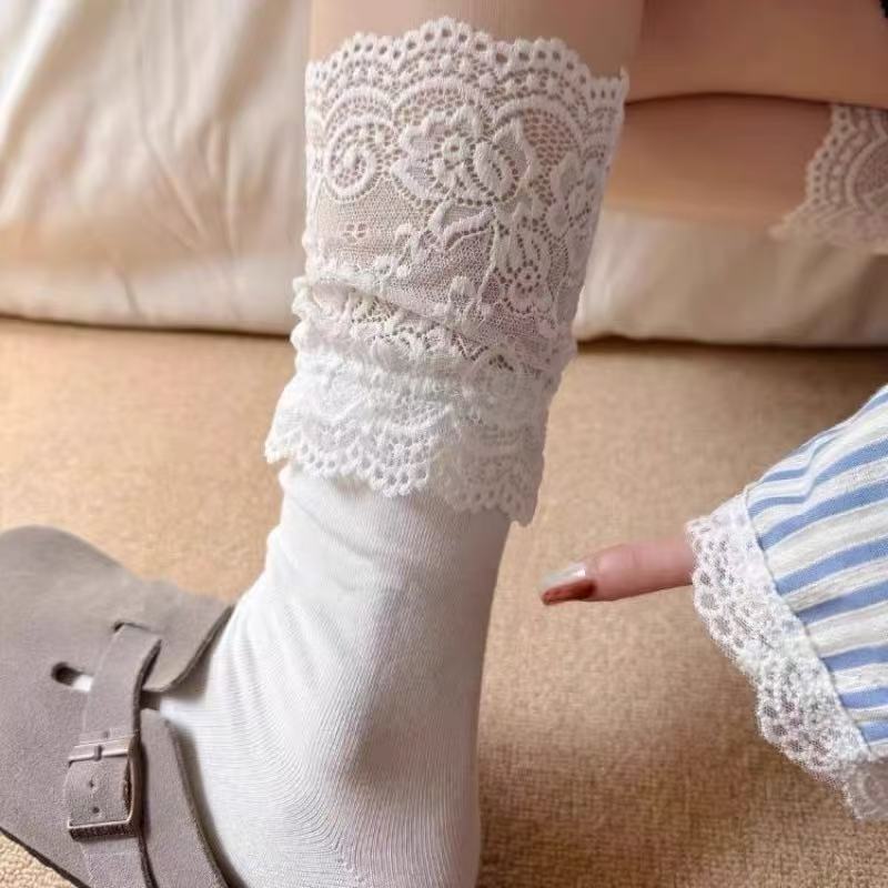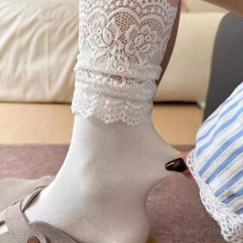 纯棉中筒蕾丝花边袜子女仙气飘飘白色黑色纯色日系春秋柔软棉袜