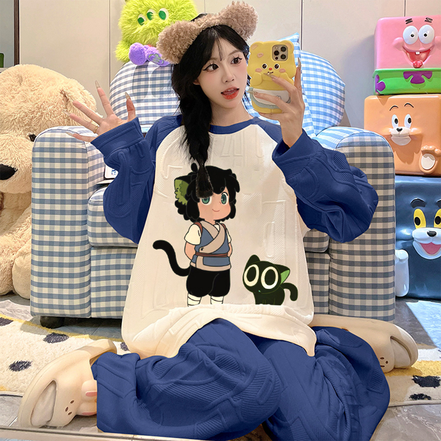 大码 春秋开衫 女士家居服 加厚珊瑚绒睡衣女冬法兰绒加绒套装 秋冬季