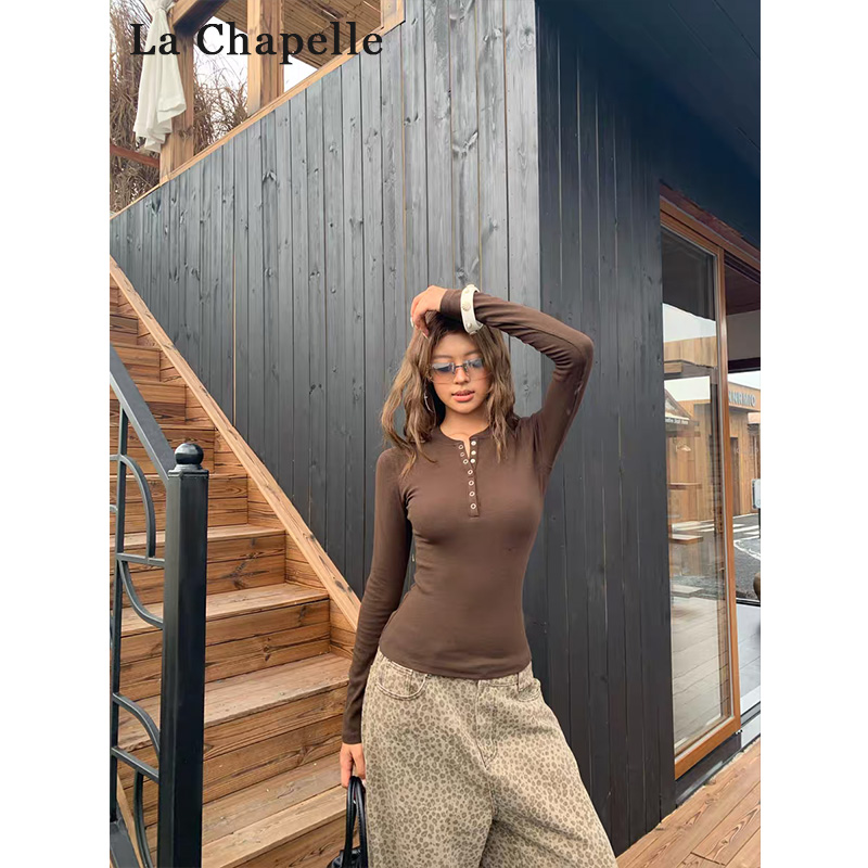辣妹打底衫 T恤女秋季 美拉德系扣复古V领长袖 上衣 Chapelle