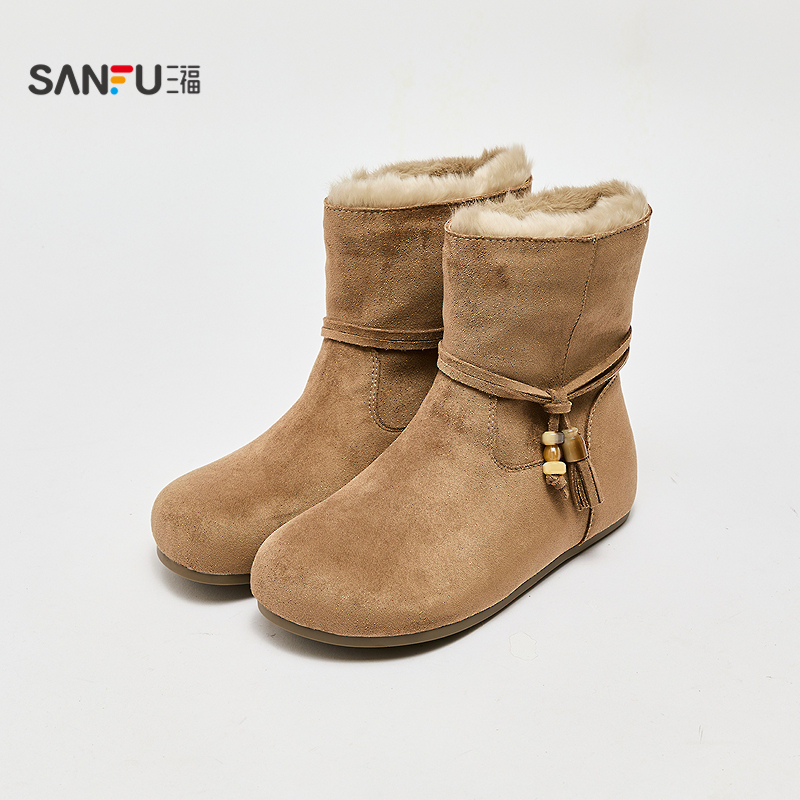 849769 口甜美圆头女鞋 三福女短靴冬季 游牧暖绒绕带串珠翻毛鞋