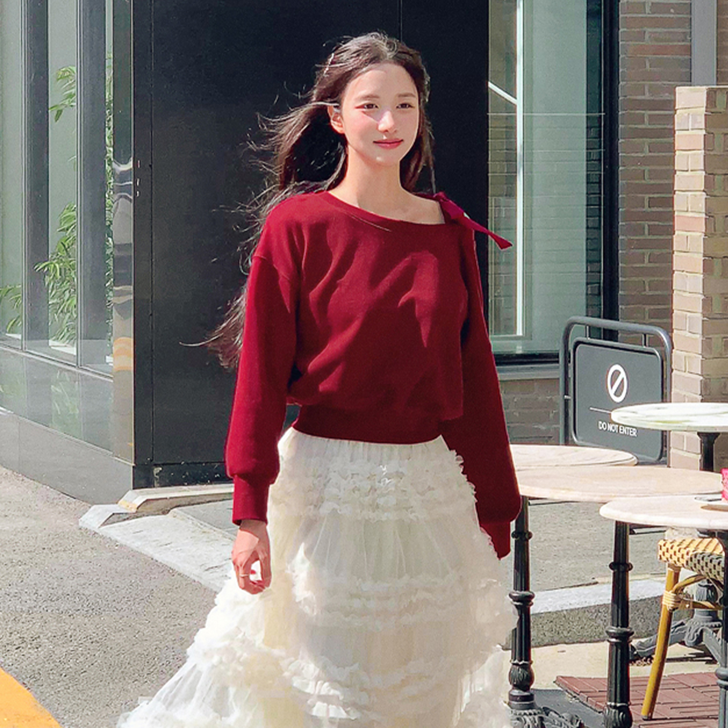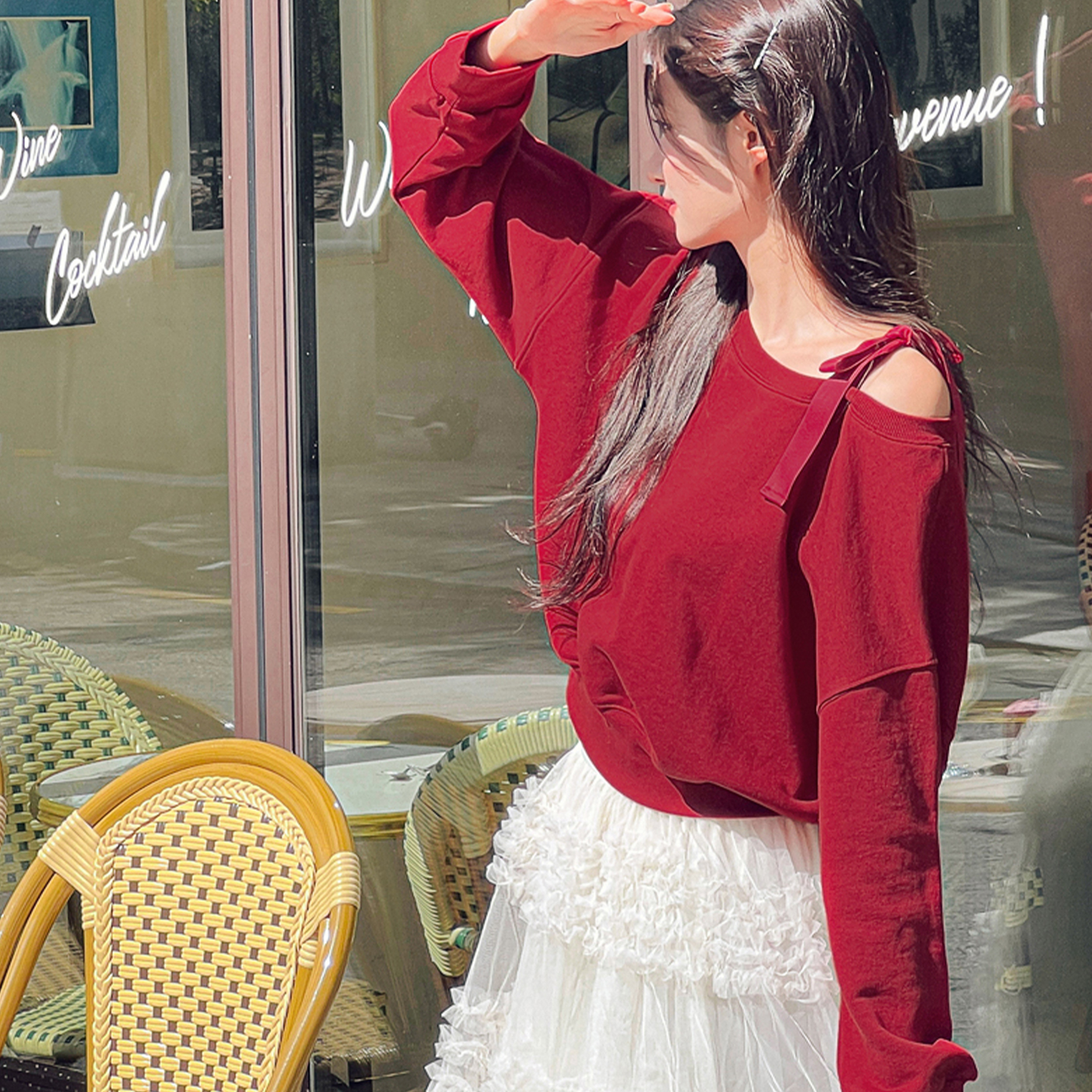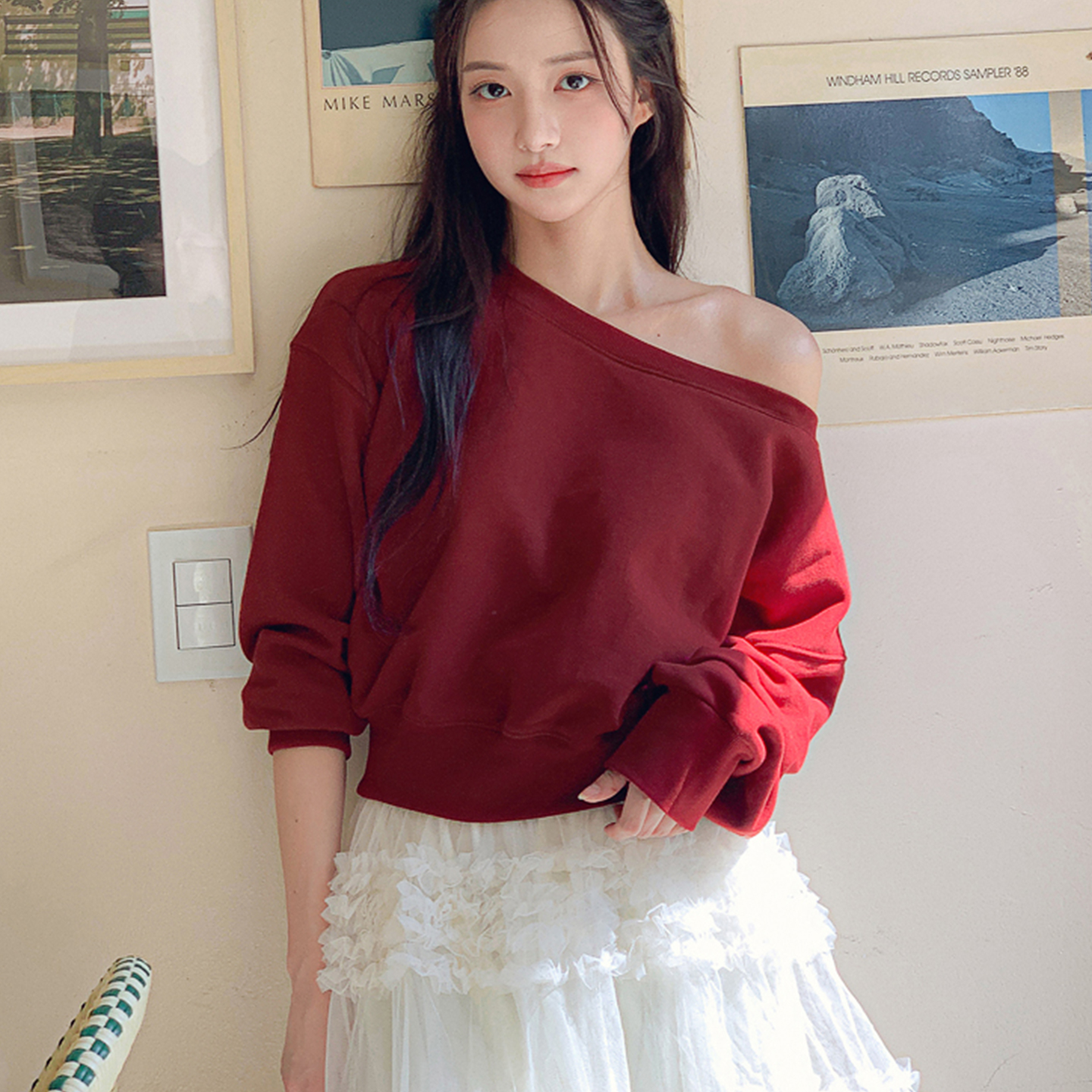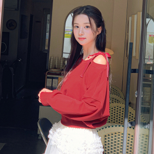 韩版 气质新款 露肩慵懒风宽松设计感上衣潮牌 卫衣女时尚 斜肩长袖
