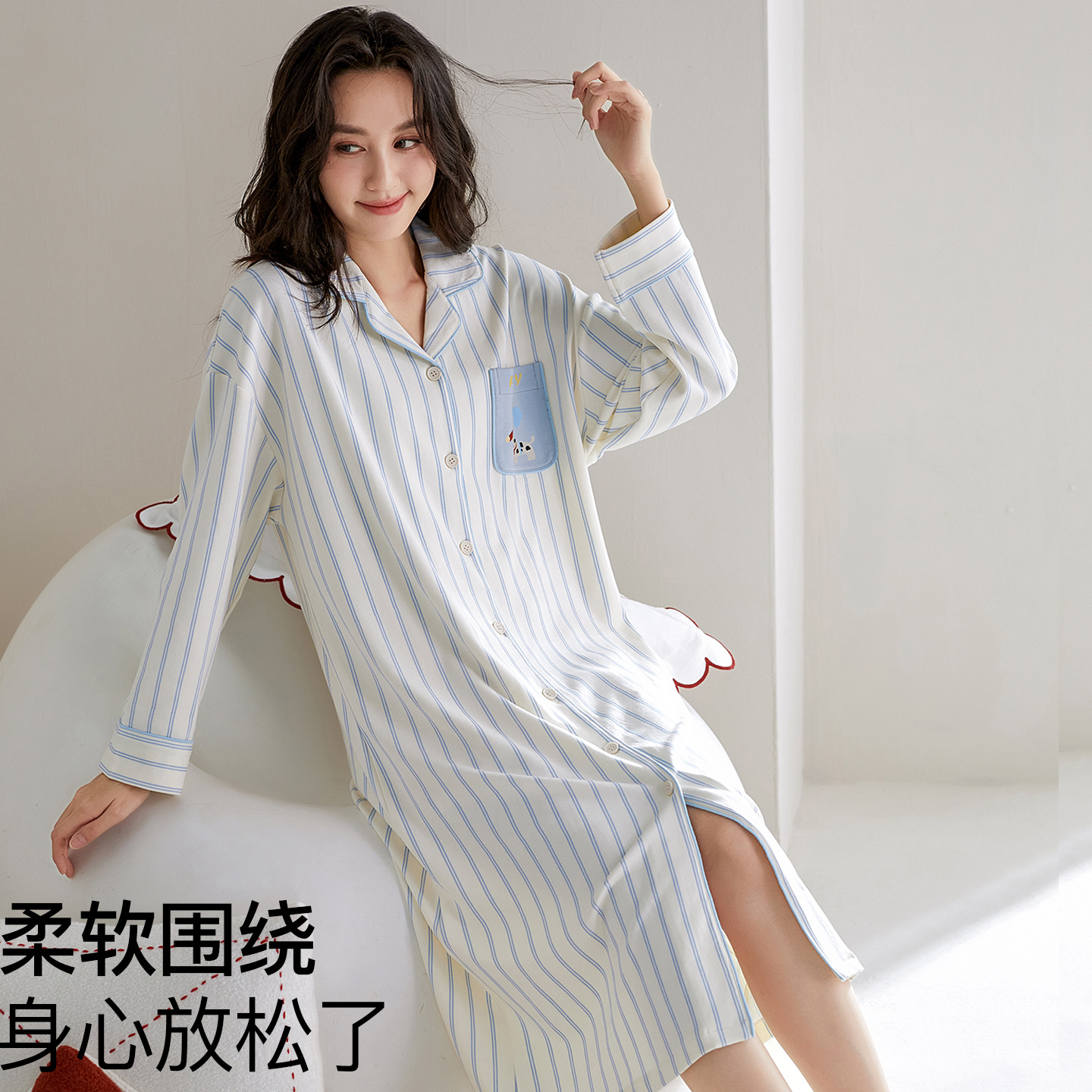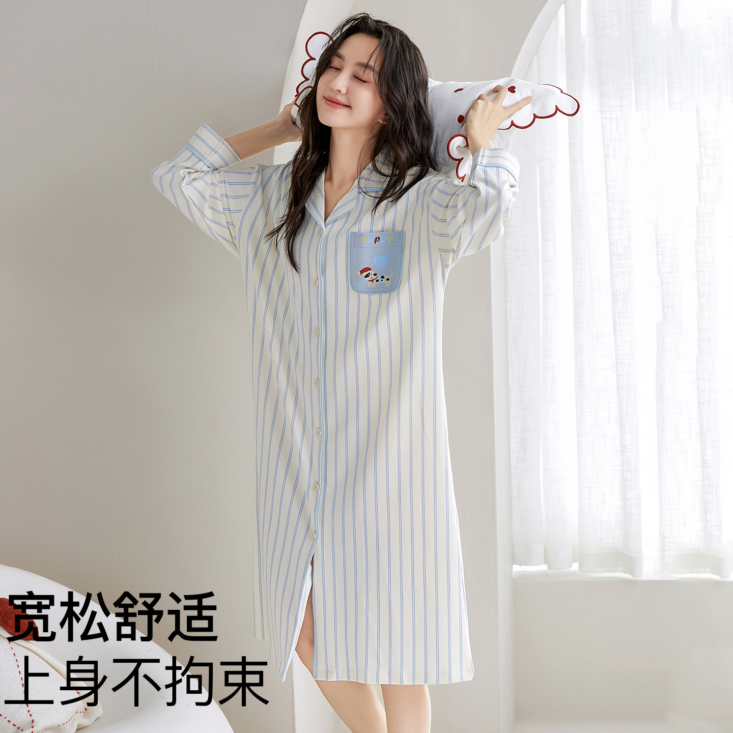 猫人100%纯棉睡裙女带胸垫春秋季 条纹睡衣可外穿家居服冬 2025新款