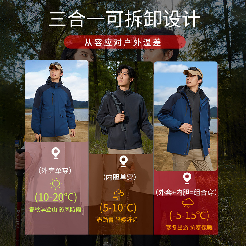 骆驼户外山系冲锋衣男三合一可拆卸内胆防暴雨秋冬旅行耐磨外套女