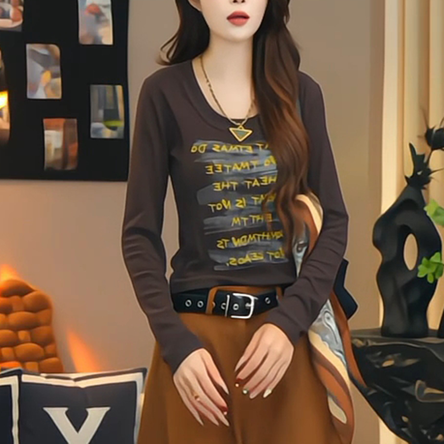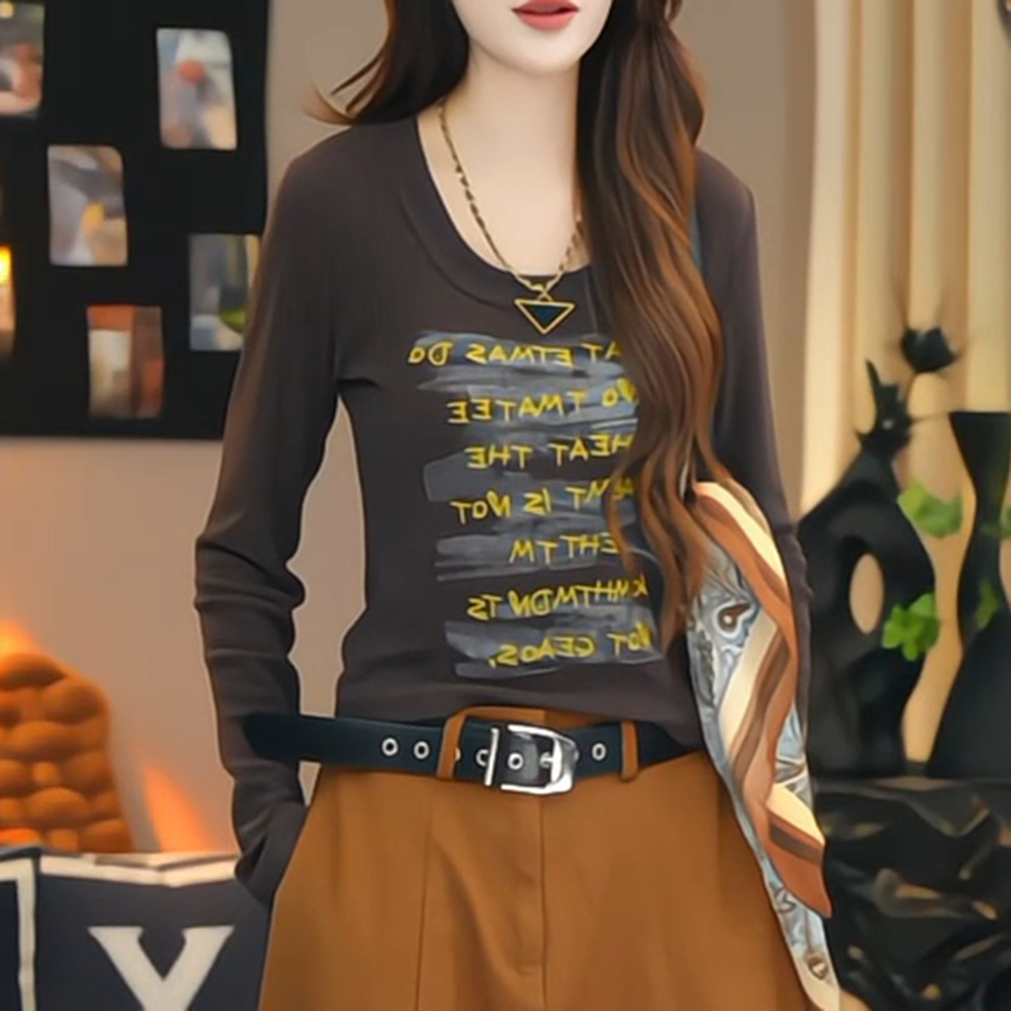 显瘦内搭打底衫 正肩t恤女早秋修身 上衣 韩系字母印花圆领长袖 大码