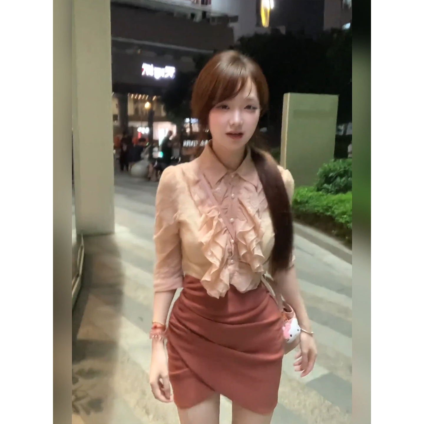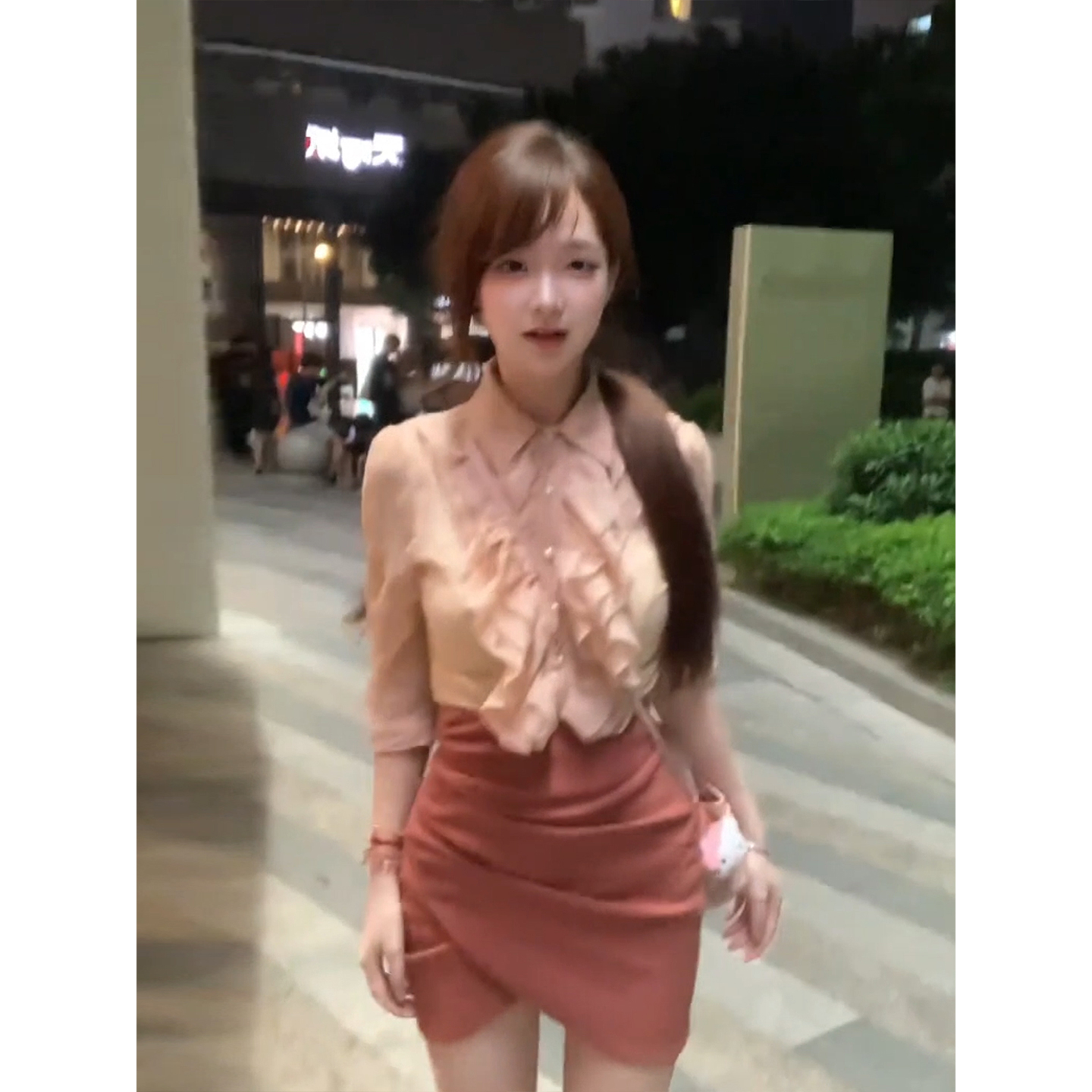 女25年早秋高腰包臀裙套装 花边衬衫 微胖复古温柔风粉色灯笼袖 XZY