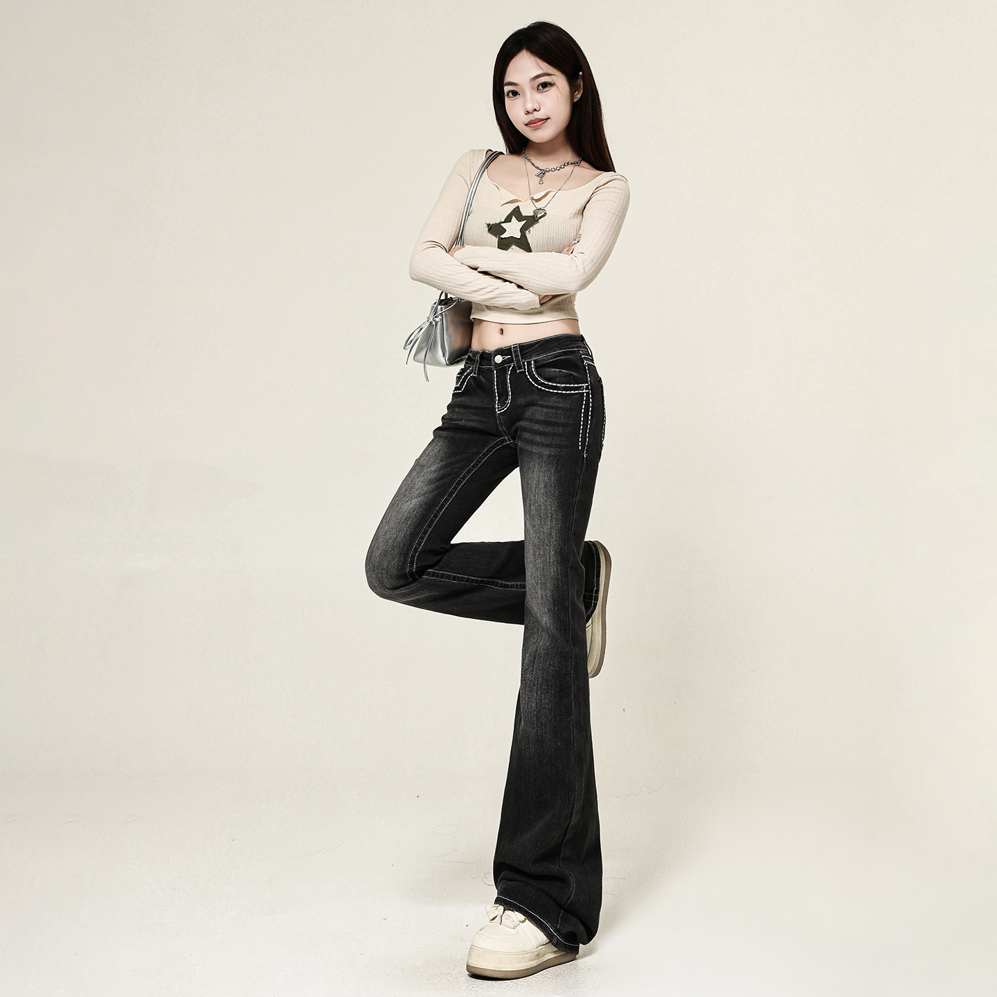 高街黑色微喇牛仔裤 显瘦弹力喇叭长裤 女2025秋季 高腰修身 新款 美式
