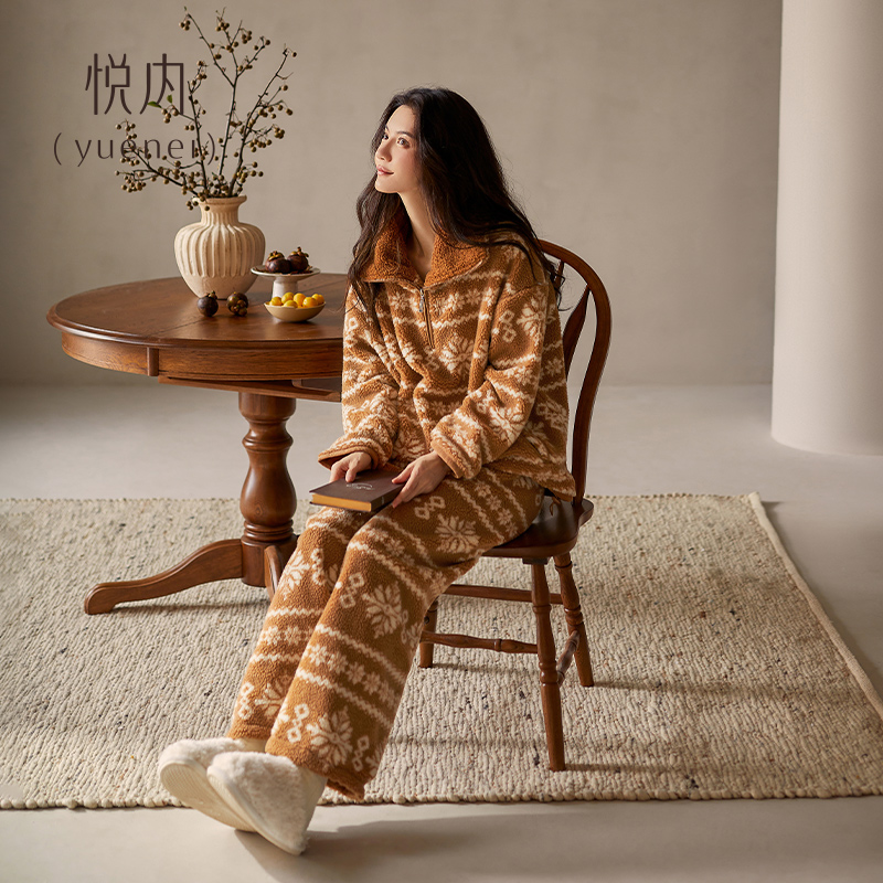 悦内睡衣女款 法兰绒加厚加绒珊瑚绒保暖家居服费尔岛可外穿 秋冬季