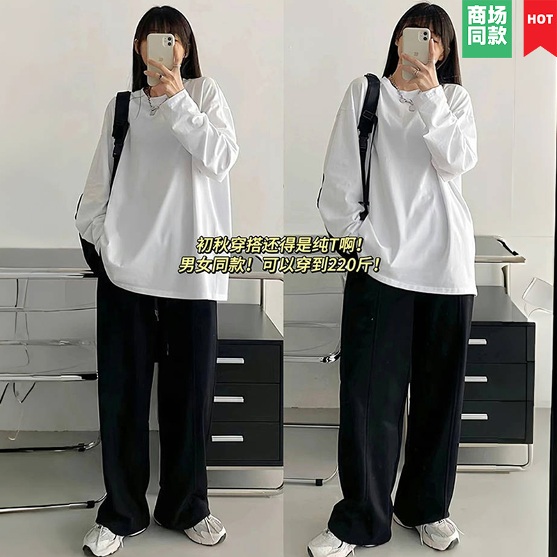 潮牌上衣ins设计感 秋季 买一送一男t恤长袖 纯棉圆领白色内搭打底衫