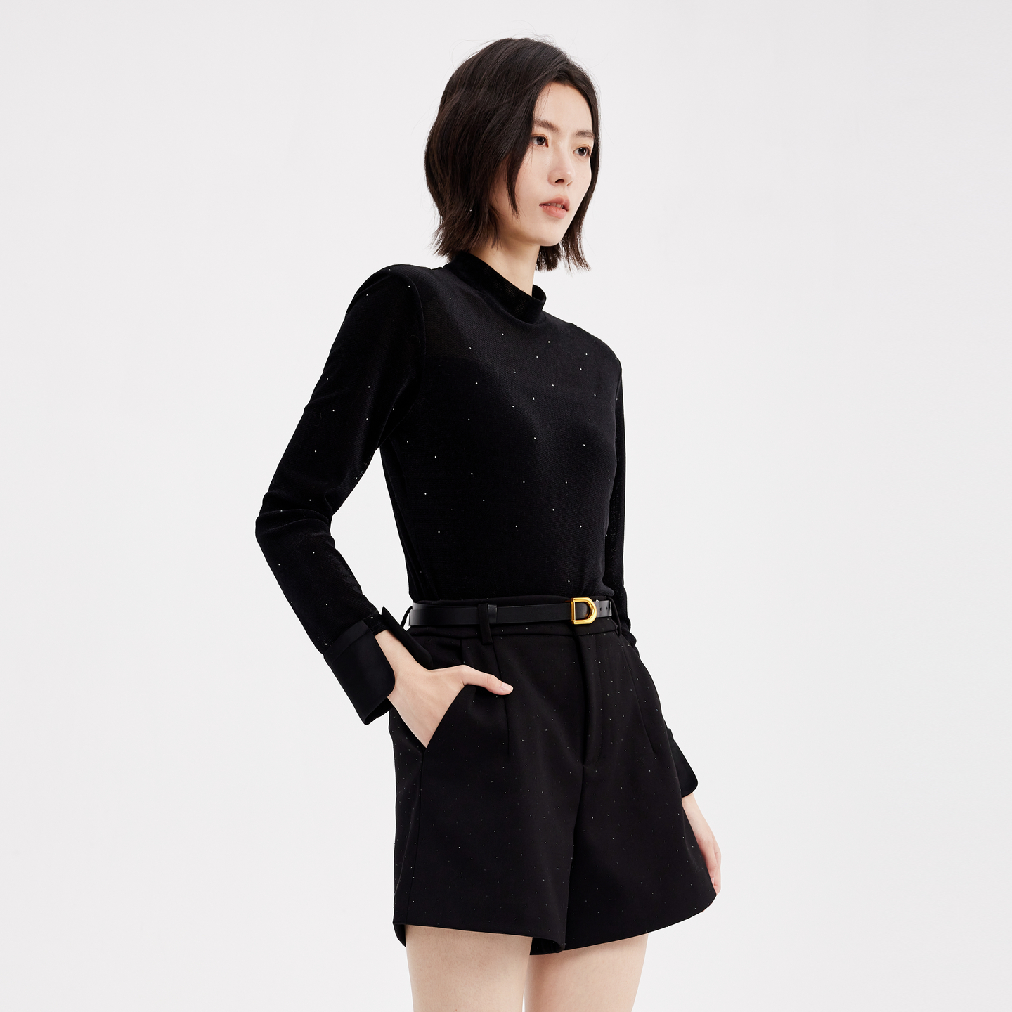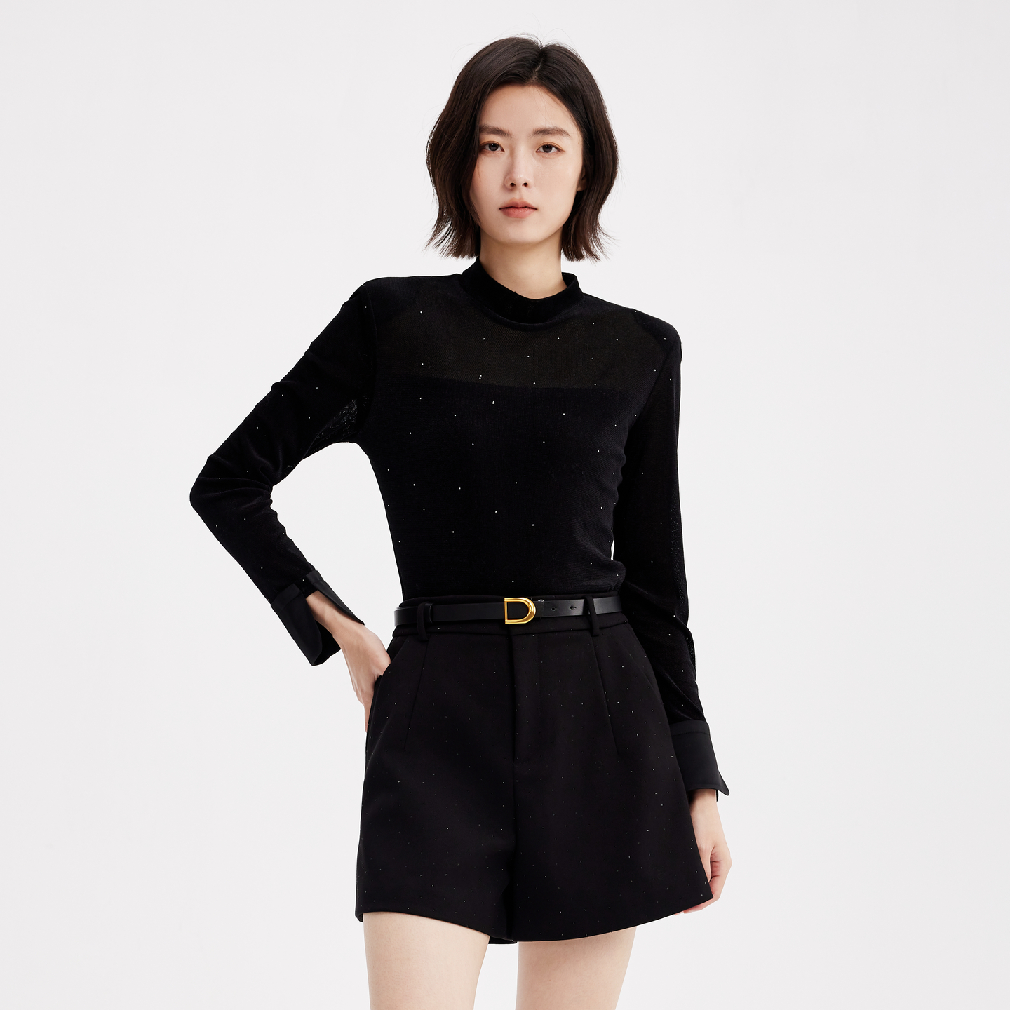 打底衫 轻奢高级感修身 新款 飘蕾黑色小波点满天星设计T恤2025冬季