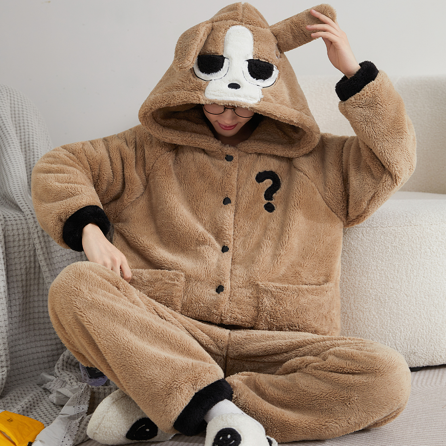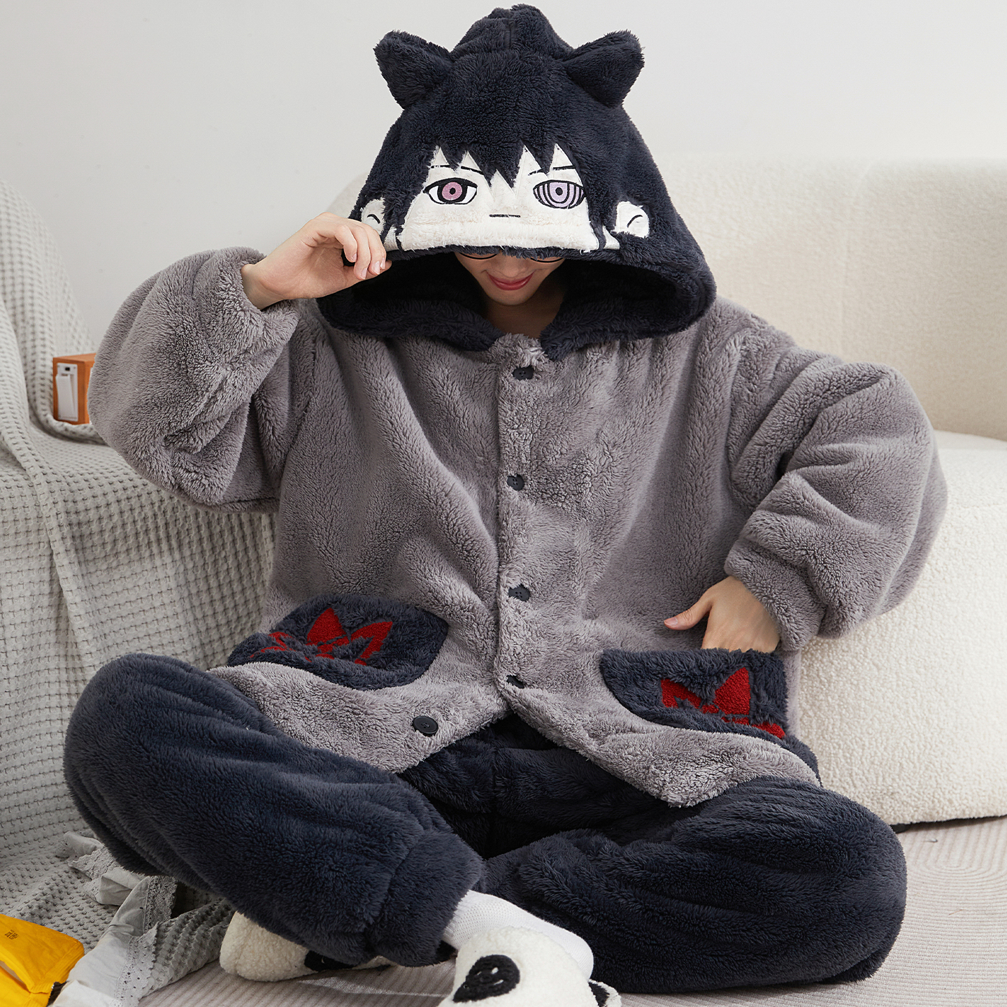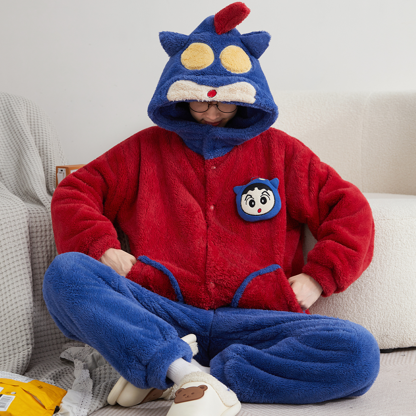 男生家居服套装 睡衣男士 加绒加大码 加厚连帽卡通开衫 珊瑚绒秋冬季