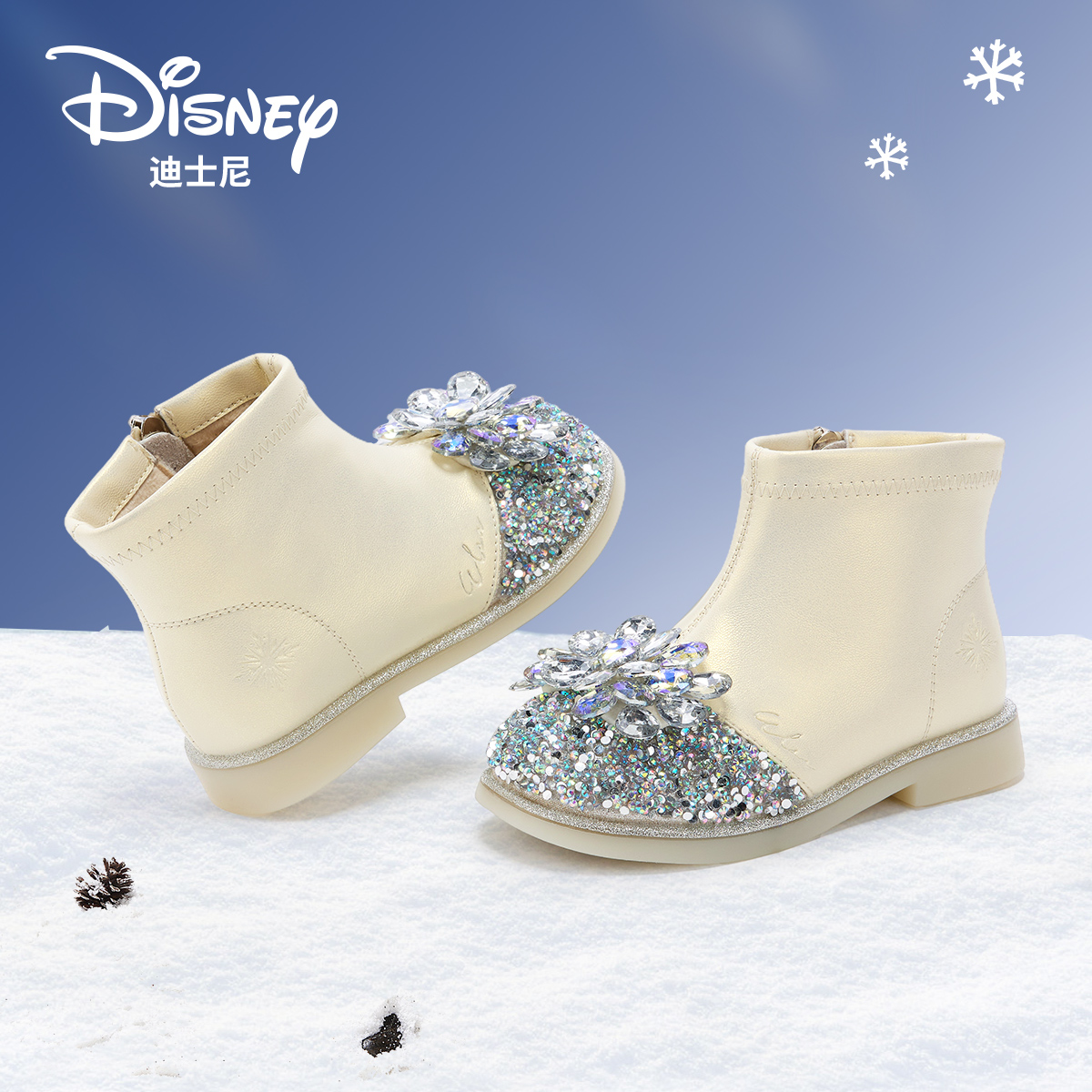 迪士尼艾莎公主2025秋冬季 子 儿童靴子女童短靴洋气加绒皮靴水晶鞋