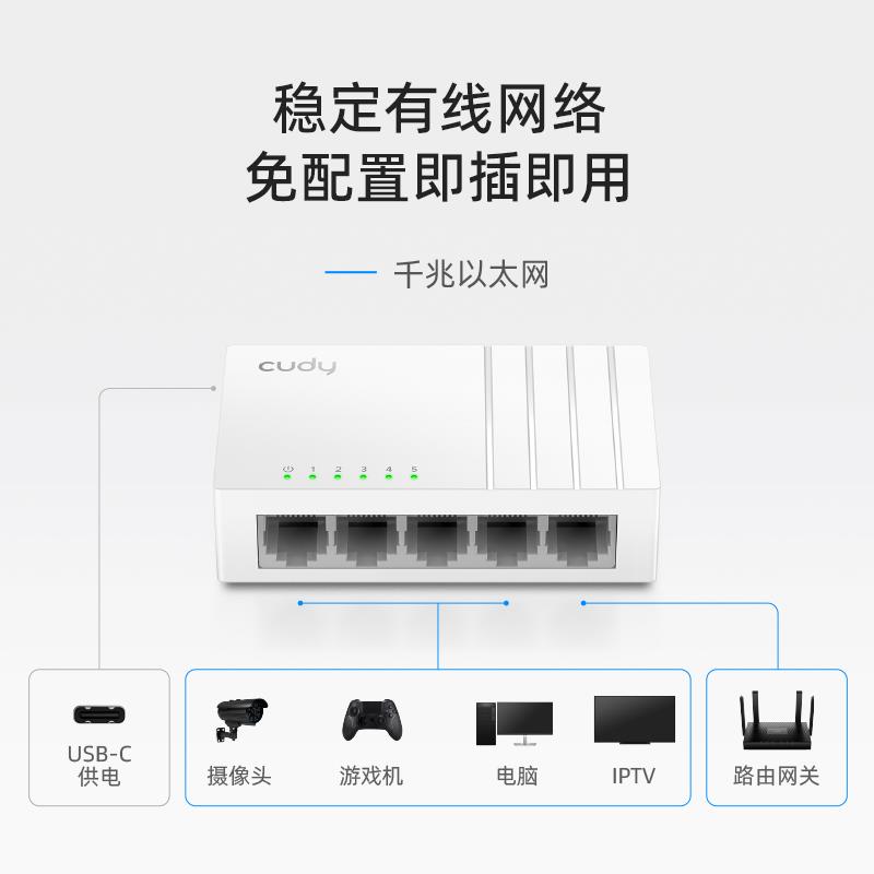 C供电网口扩展器即插即用路由分流器网络集线器分线器家用学生宿舍企业监控GS105U USB Cudy 5口全千兆交换机