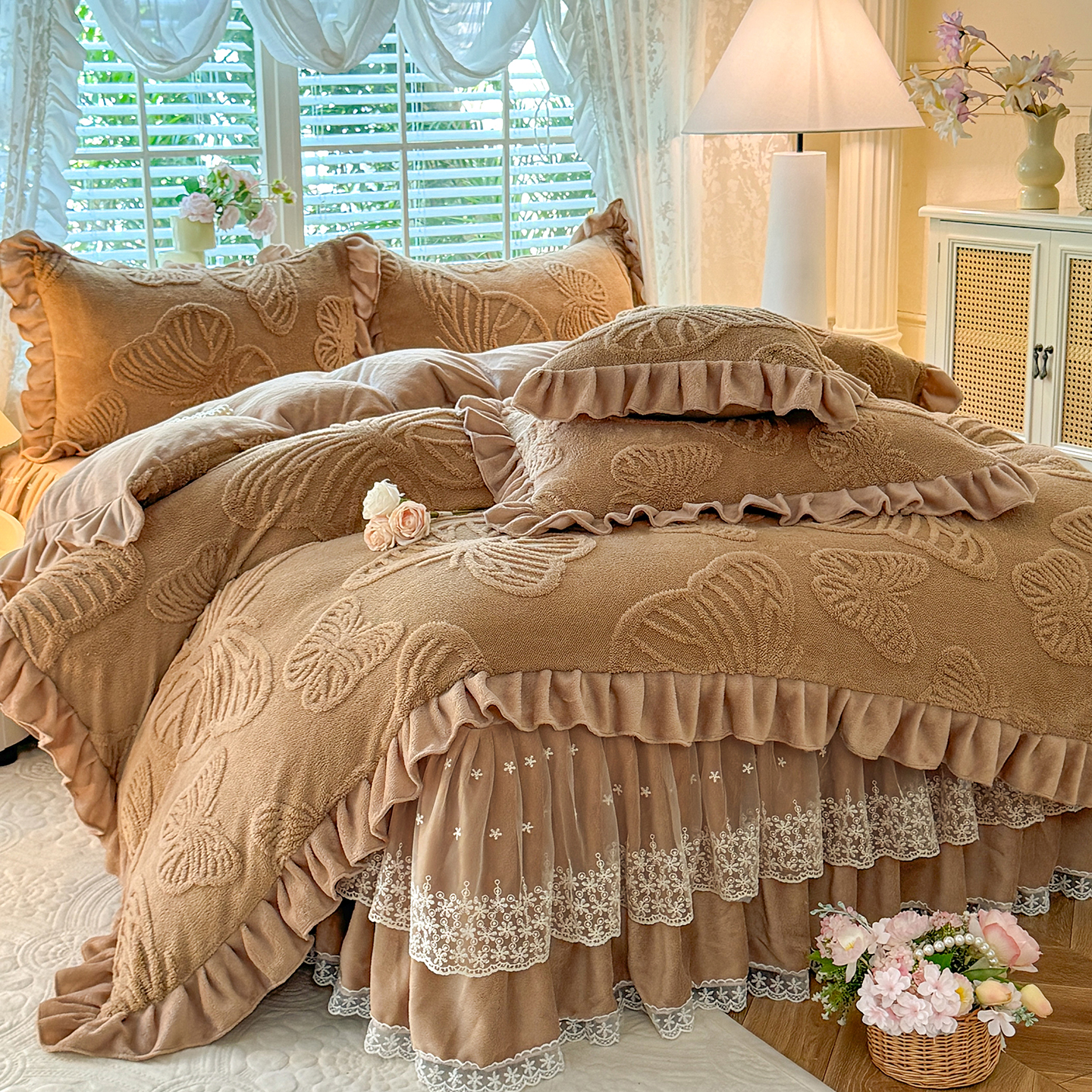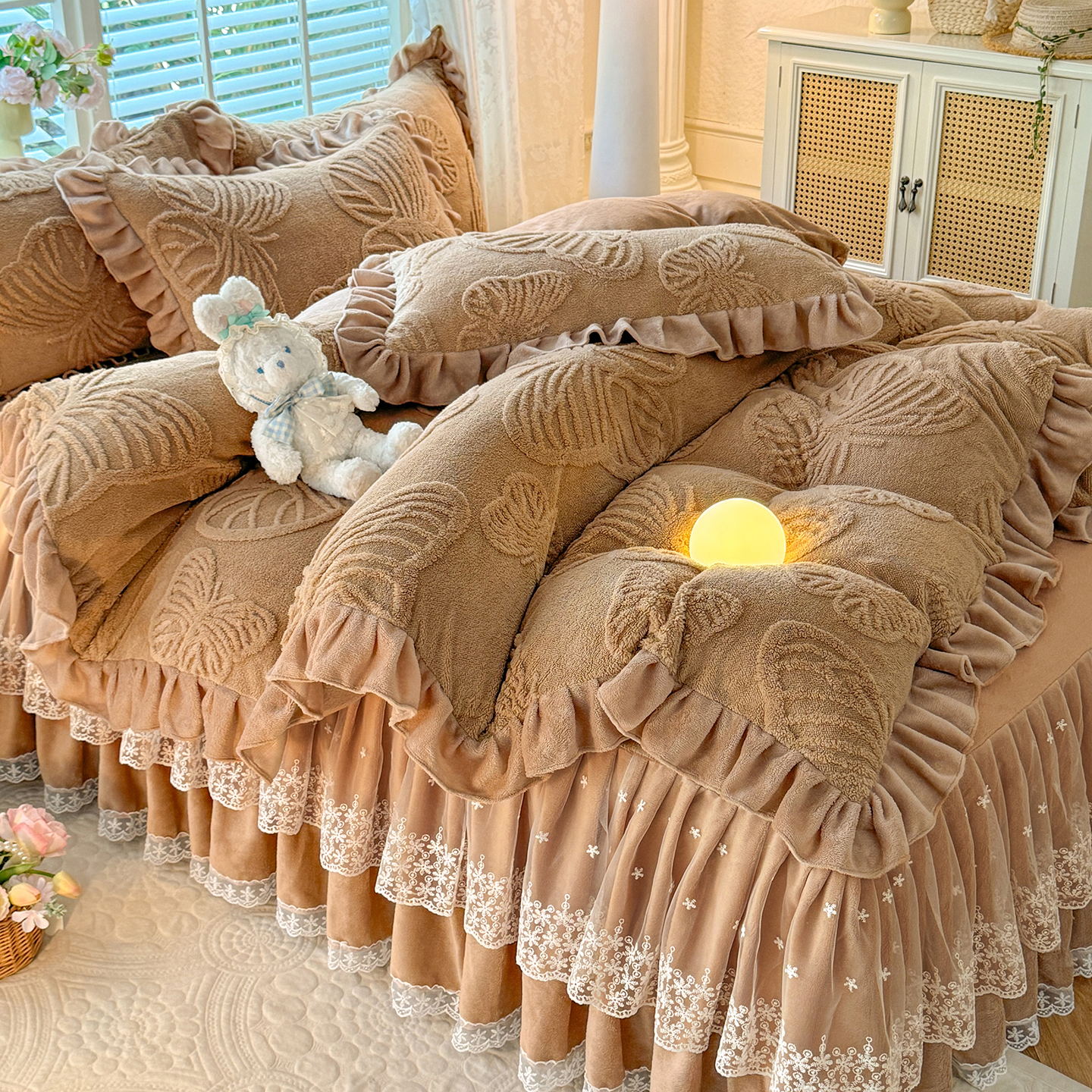 韩版 雕花绒牛奶绒床裙四件套公主花边珊瑚绒双面绒被套床单冬季