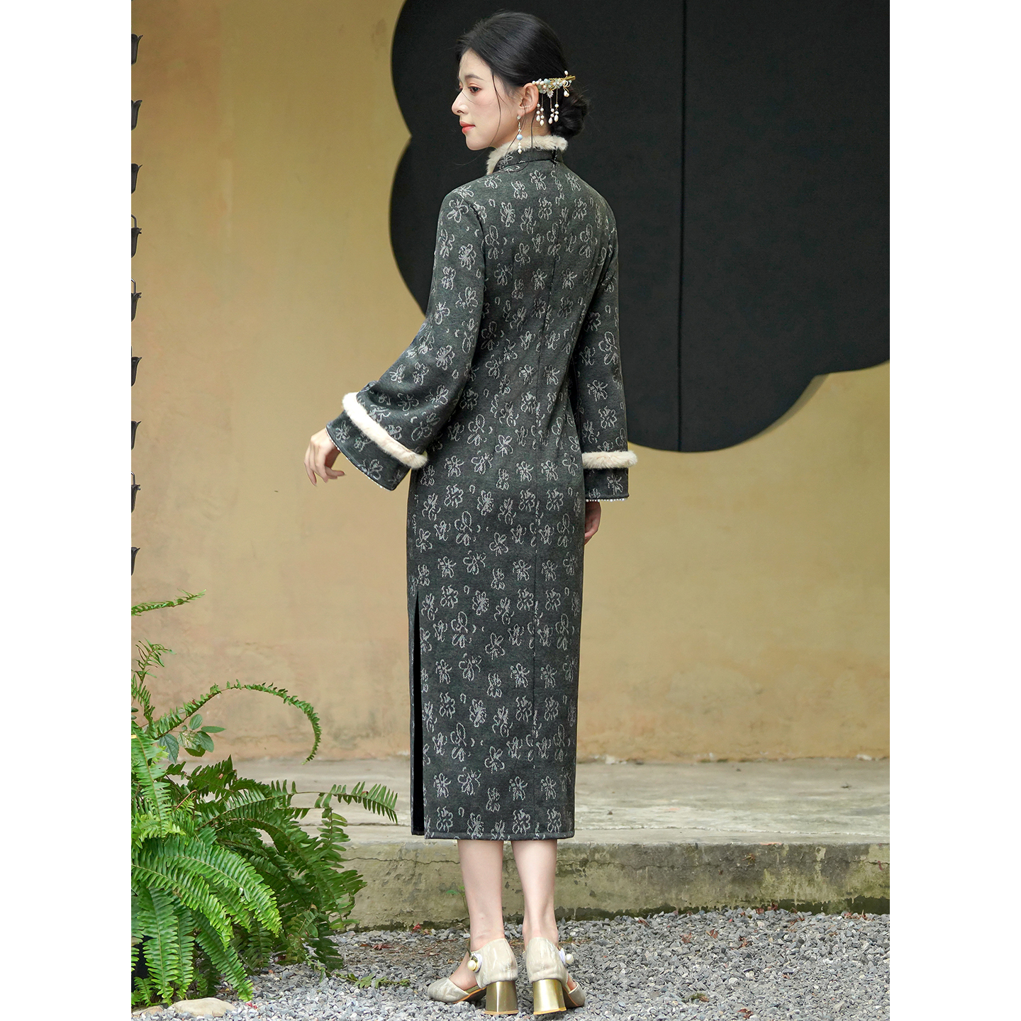 秋冬连衣裙旗袍开叉新中式 锦绒绣花 丝绒黑色长裙 潘泪滢 JKJS