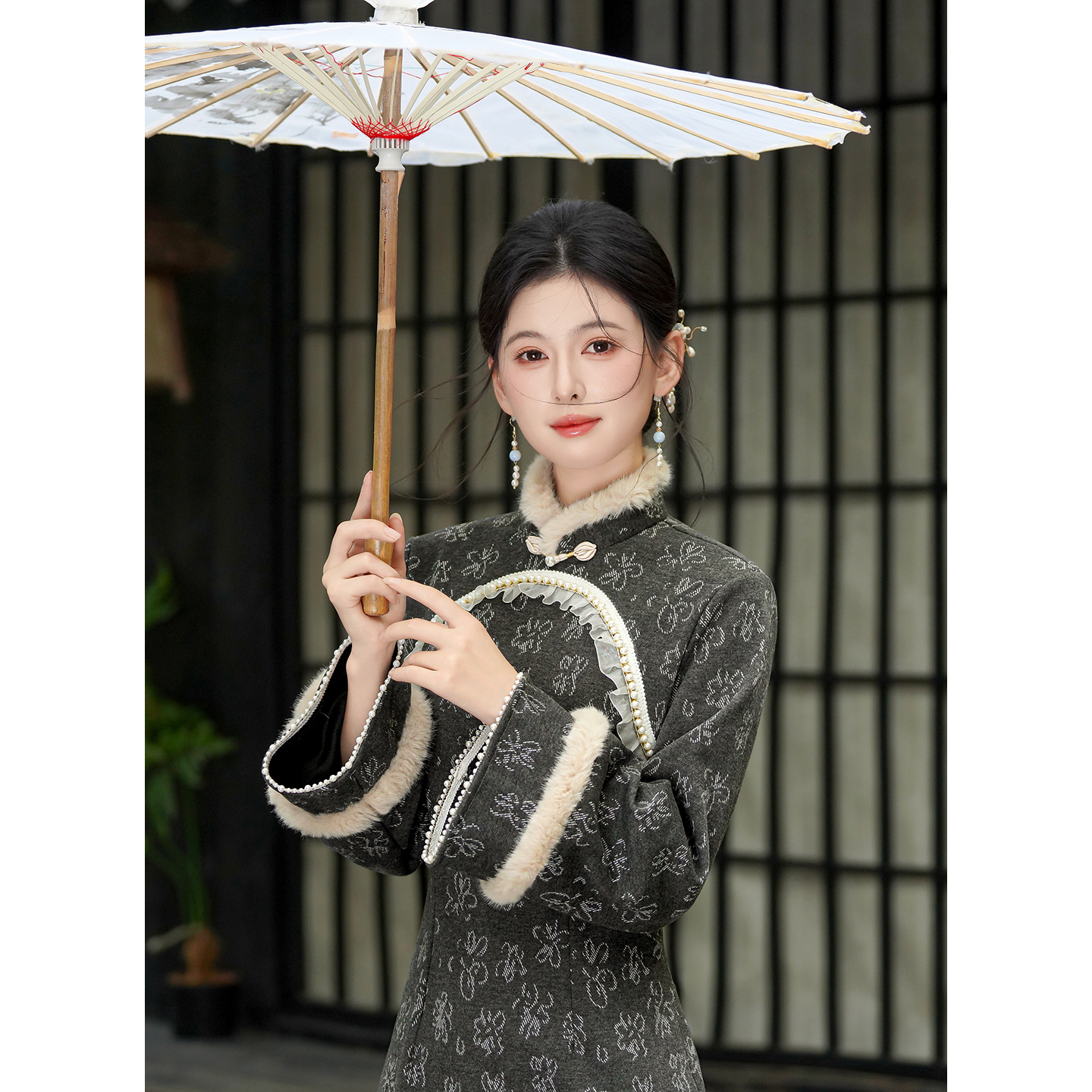 新中式 新款 国风显瘦改良旗袍裙 毛呢连衣裙女2025冬季 喜婆婆婚宴装