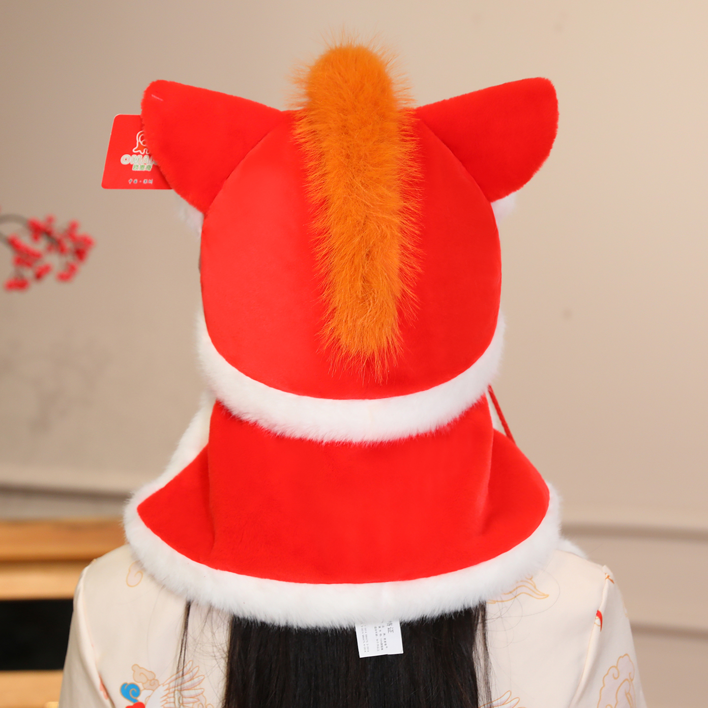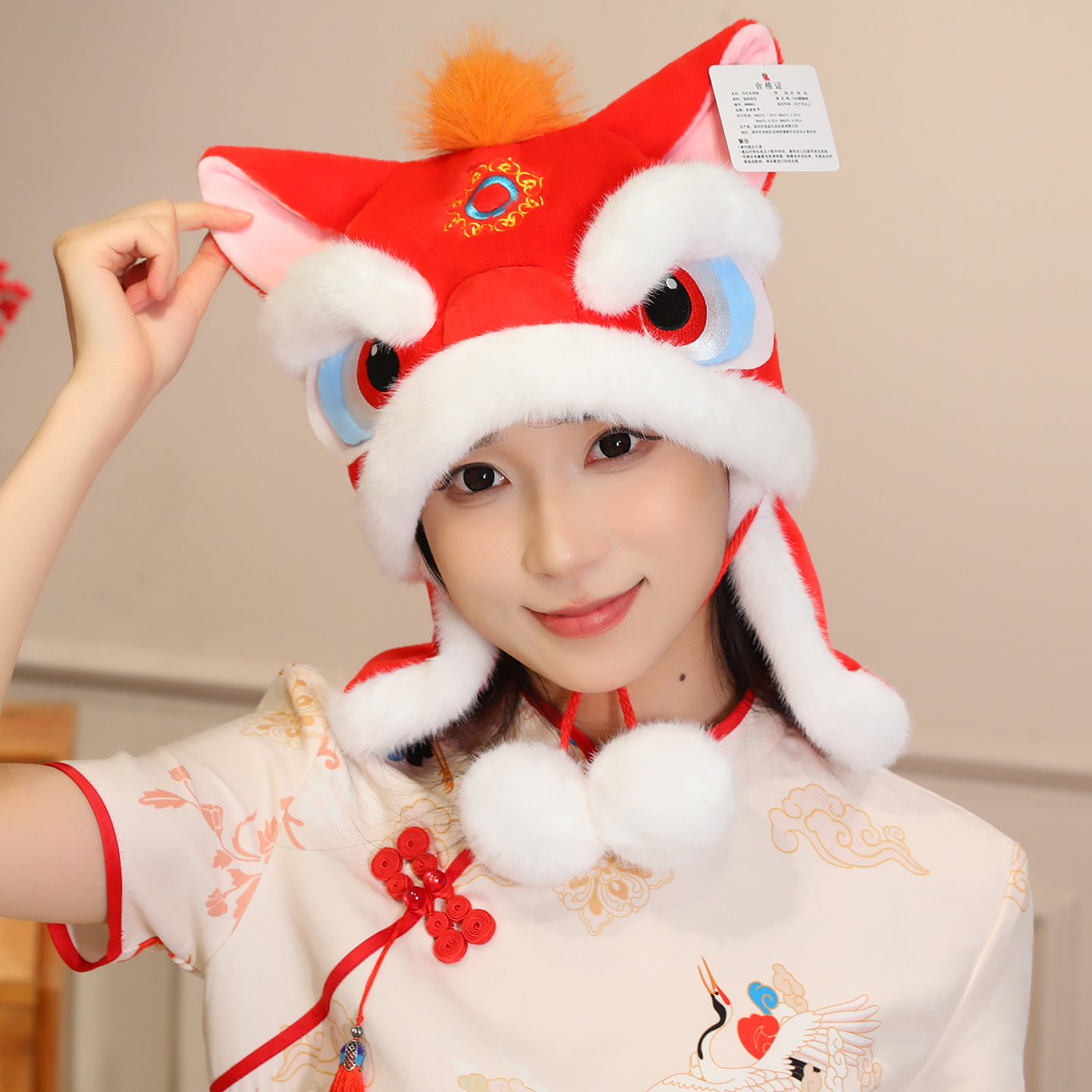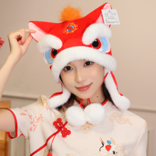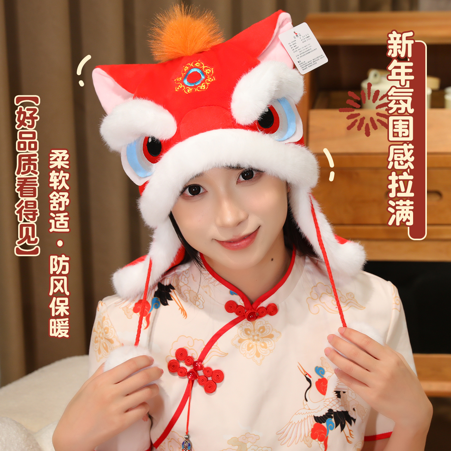 新款 国潮醒狮帽子玩偶创意狮头公仔毛绒玩具保暖护耳棉帽新年 冬季