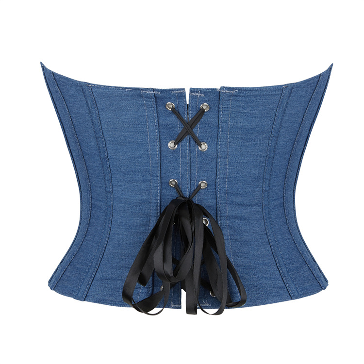 新款 蓝色牛仔布单排扣女士抹胸托胸聚拢宫廷塑身上衣temu货源