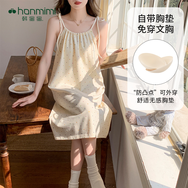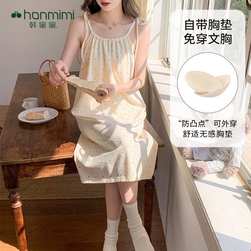 韩蜜蜜睡裙女仿棉吊带裙印花圆点自带胸垫家居服长裙 K91703