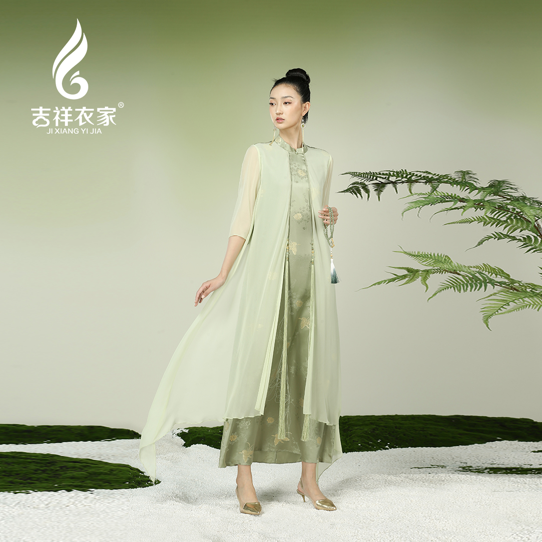 新中式 女成人日常可穿国风改良旗袍上衣连衣裙两件套茶服 汉服套装