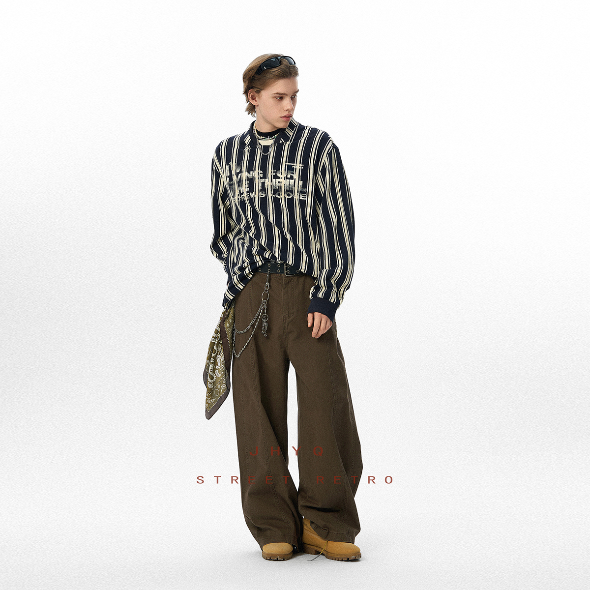 印花外穿上衣 宽松撞色潮流时尚 JHYQ复古休闲双拼V领长袖 T恤男士
