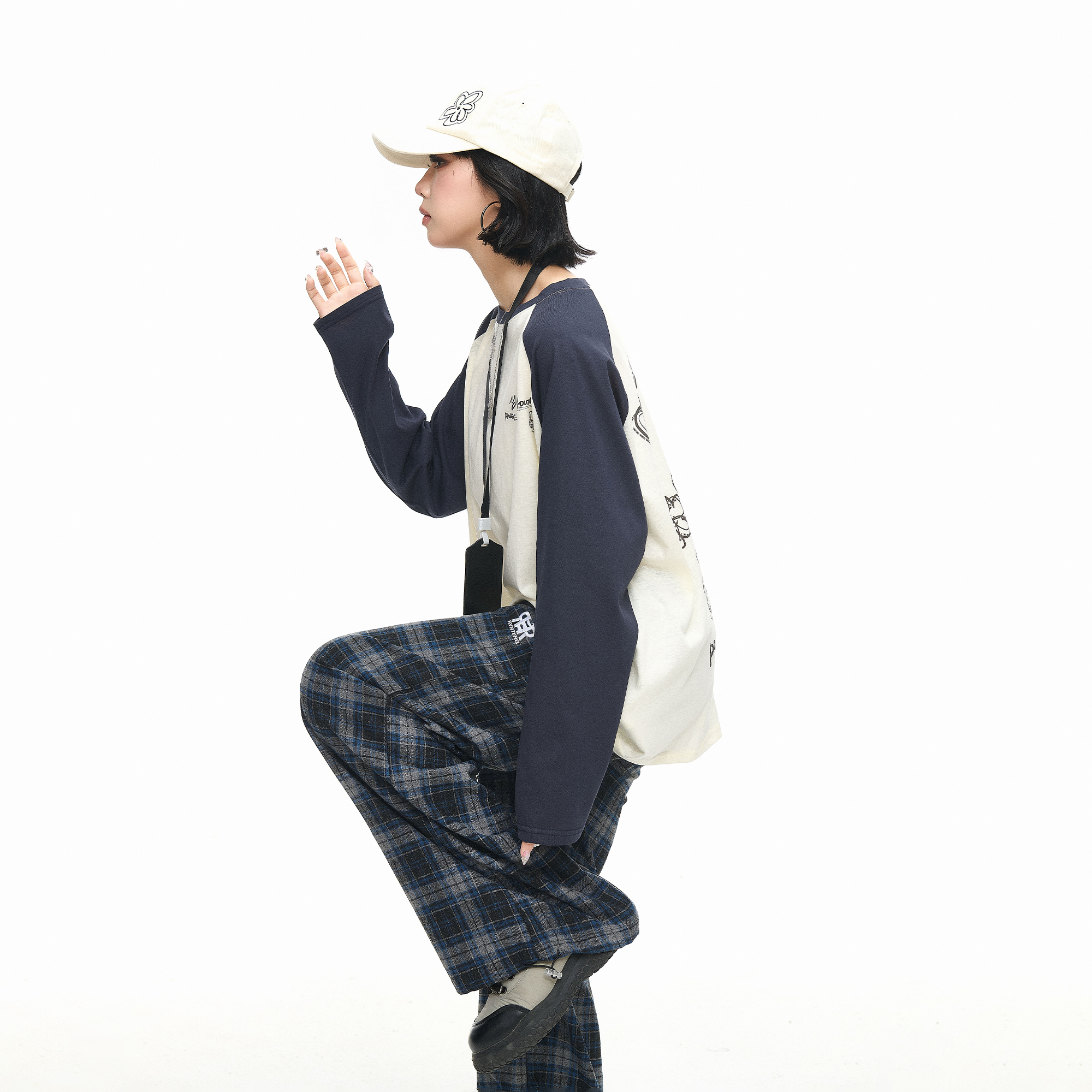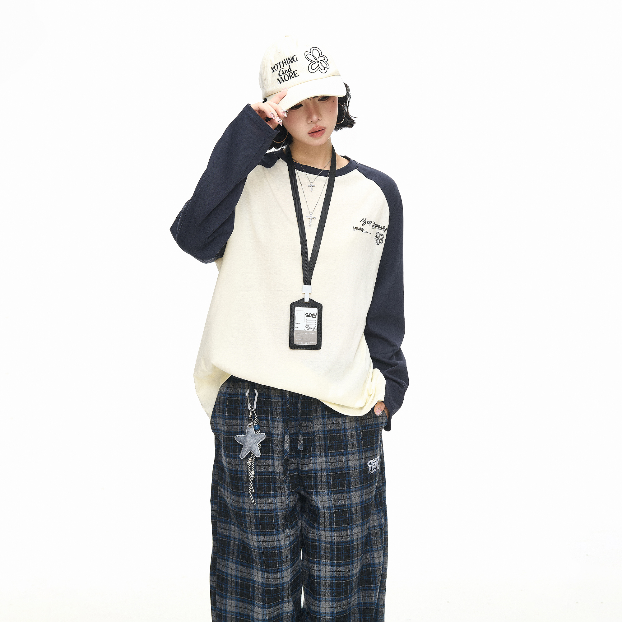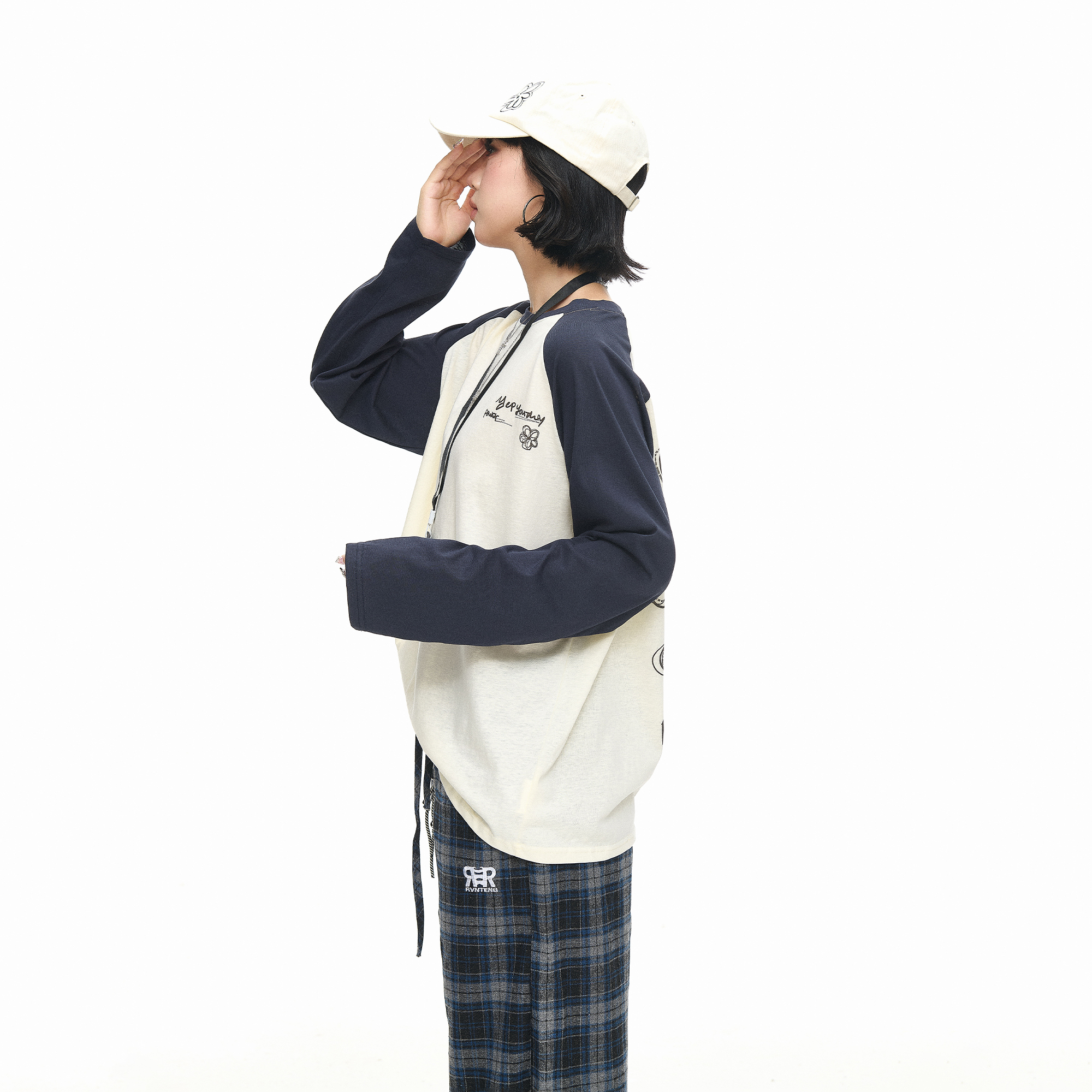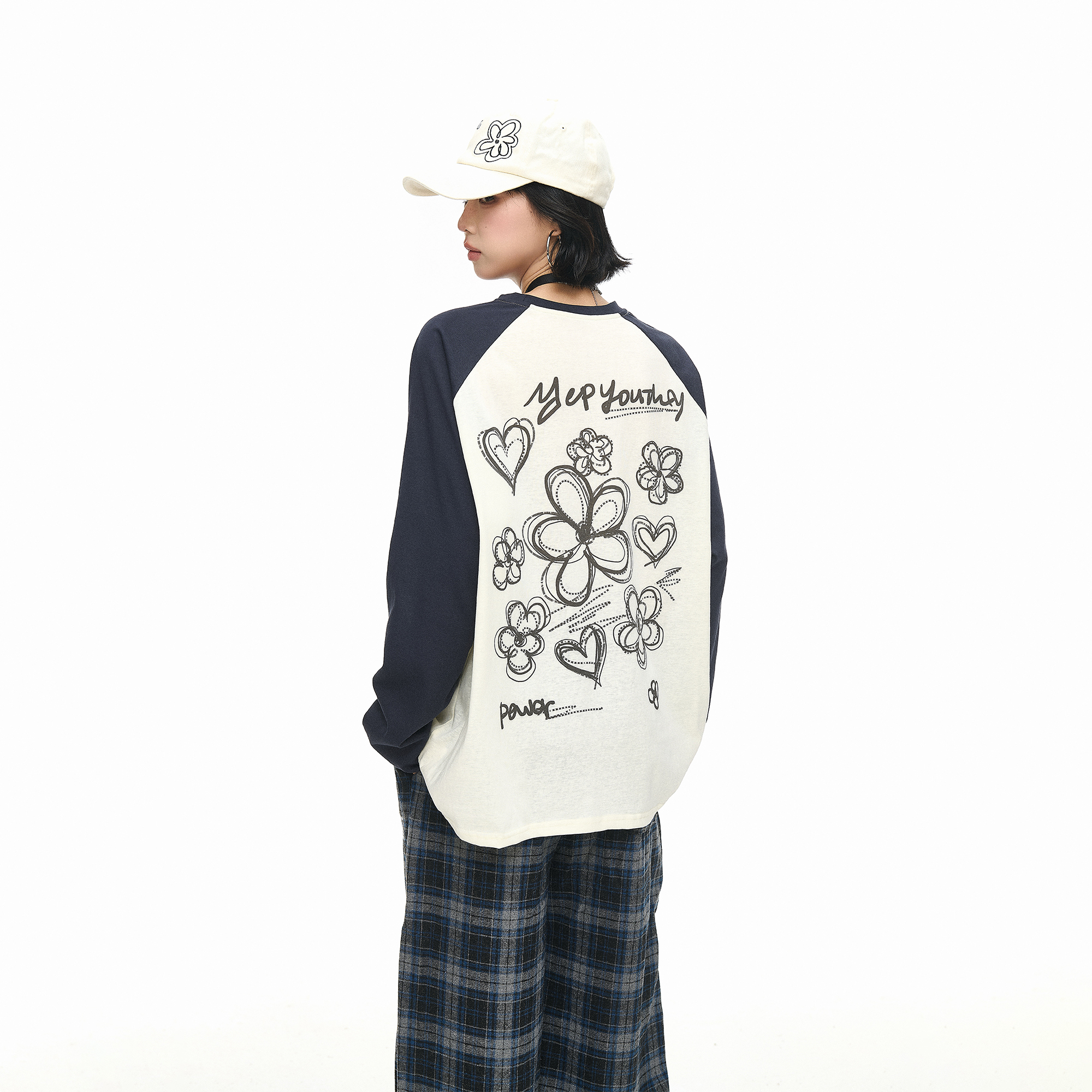 新款 美式 T恤女秋季 创意印花长袖 宽松撞色情侣圆领上衣 复古插肩袖
