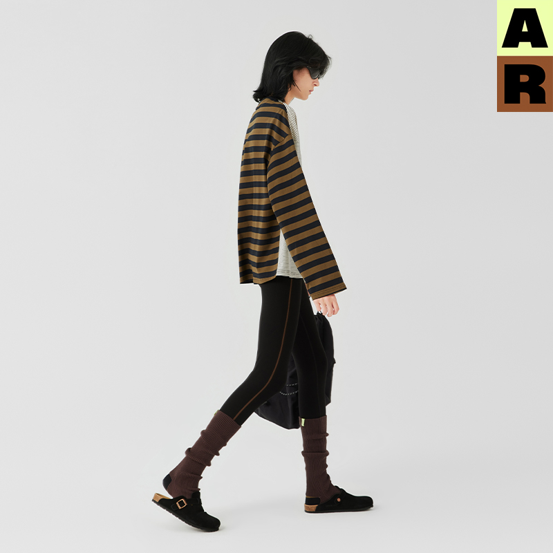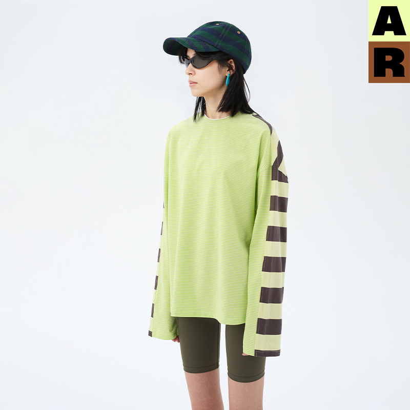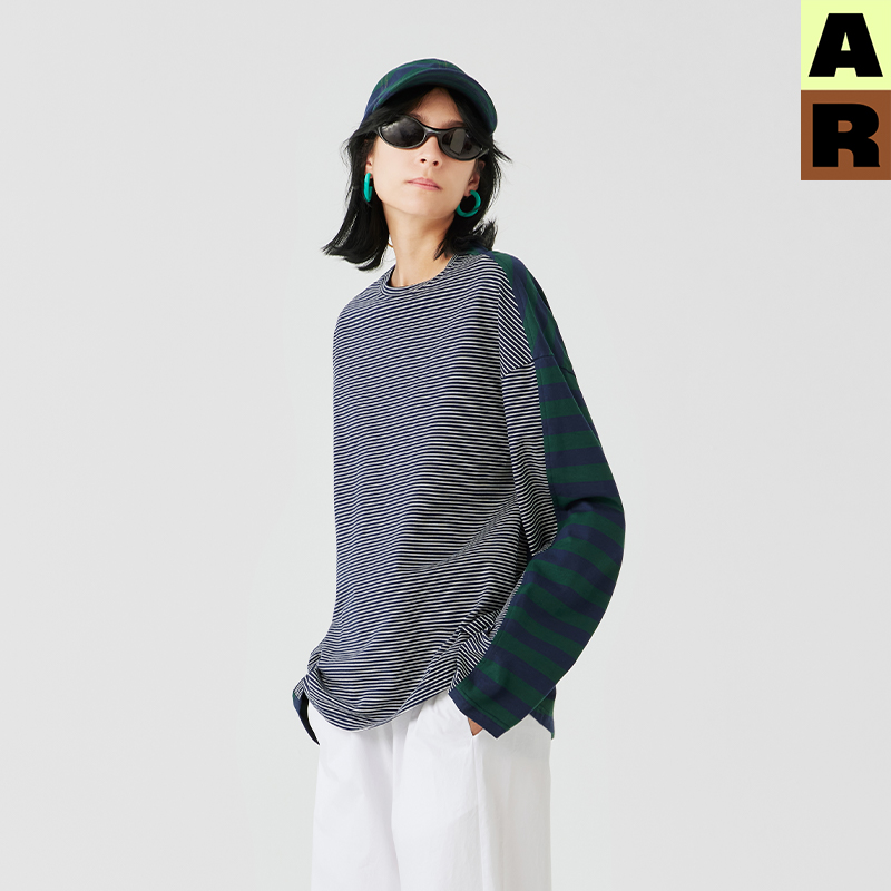 上衣新款 AR复古条纹miu系宽松长袖 T恤女撞色拼接休闲圆领打底衫