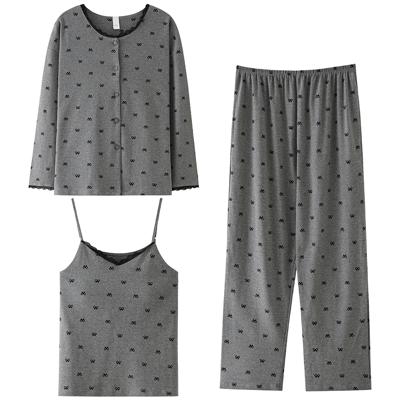 猫人纯棉带胸垫女士睡衣2025春秋吊带三件套简约休闲大码 家居服