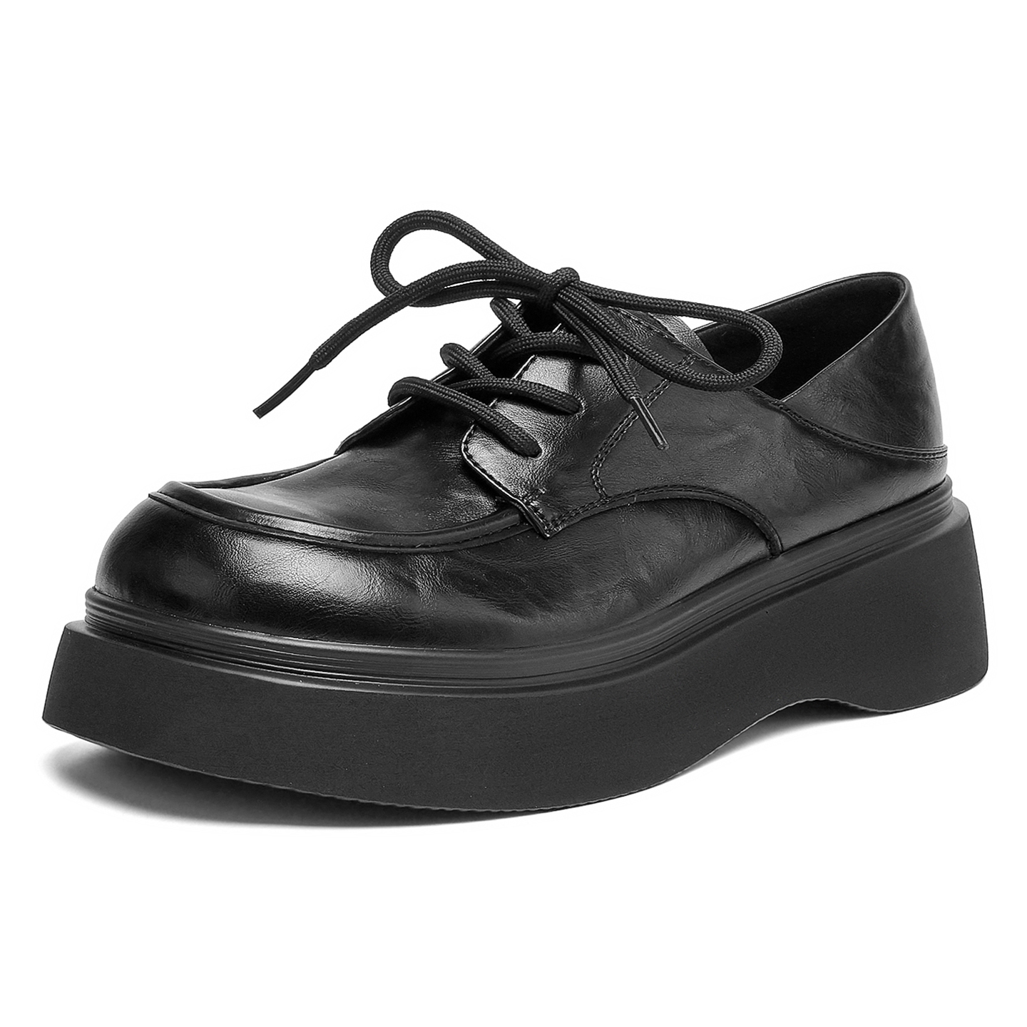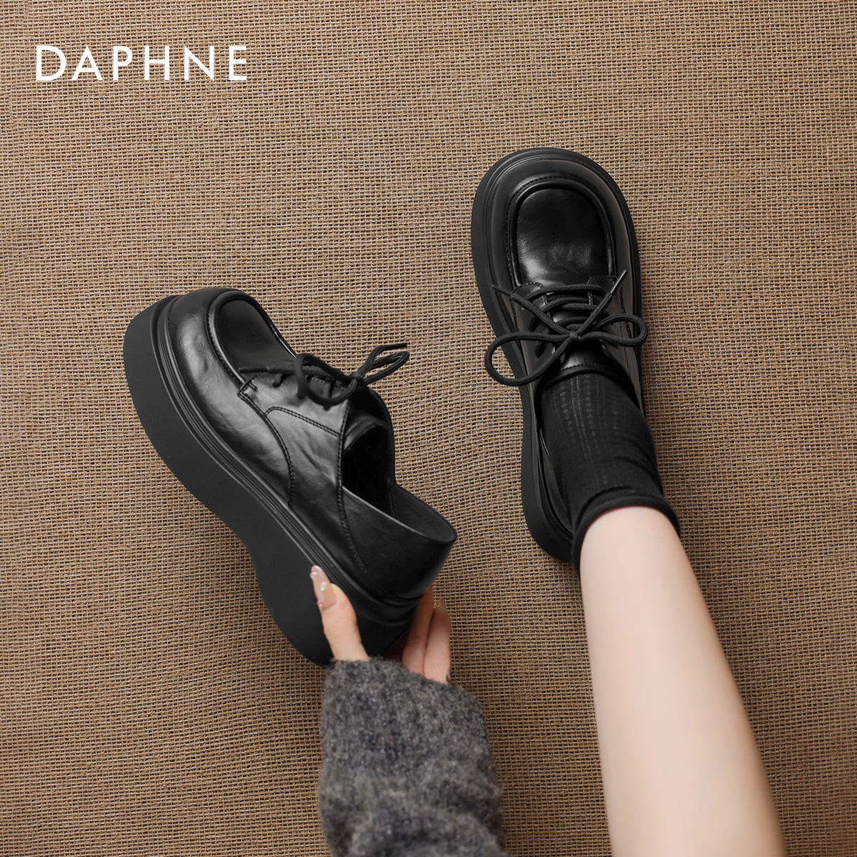 黑色百搭 英伦松糕增高女鞋 达芙妮深口粗跟单鞋 厚底系带百搭小皮鞋