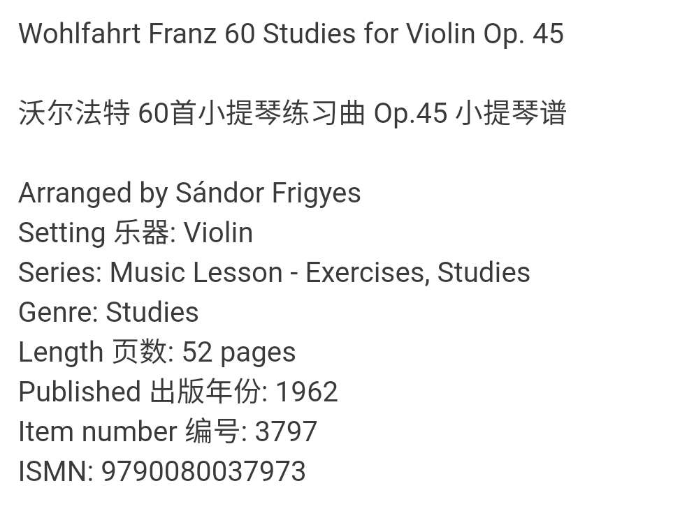 Z3797 小提琴独奏布达佩斯原版 Violin for Studies Franz Wohlfahrt 进口乐谱书 60首练习曲Op45 沃尔法特