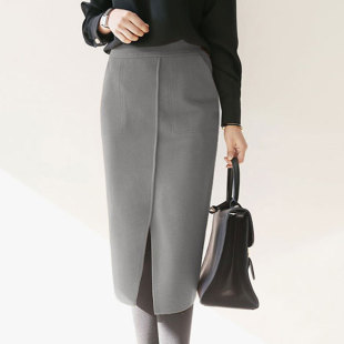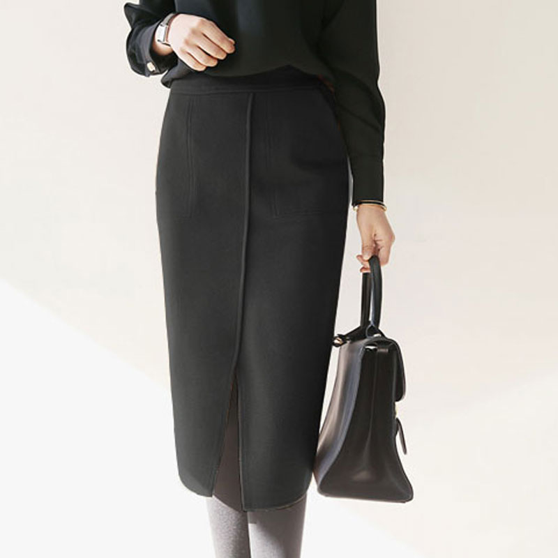 LILY2025冬新款 含羊毛弹力显瘦气质职业通勤黑色直筒裙半身裙 女装