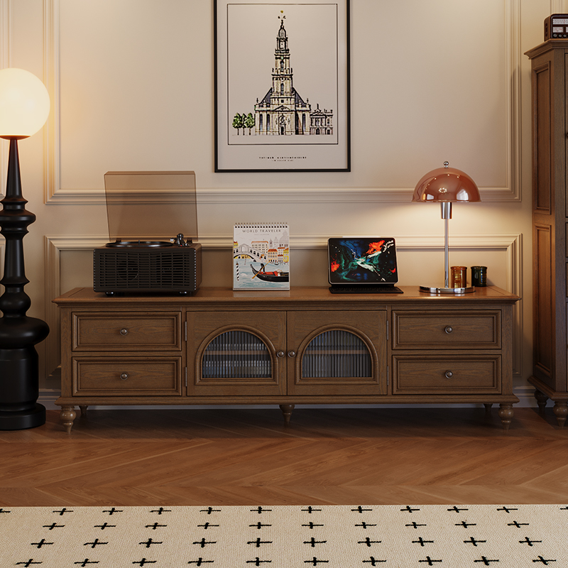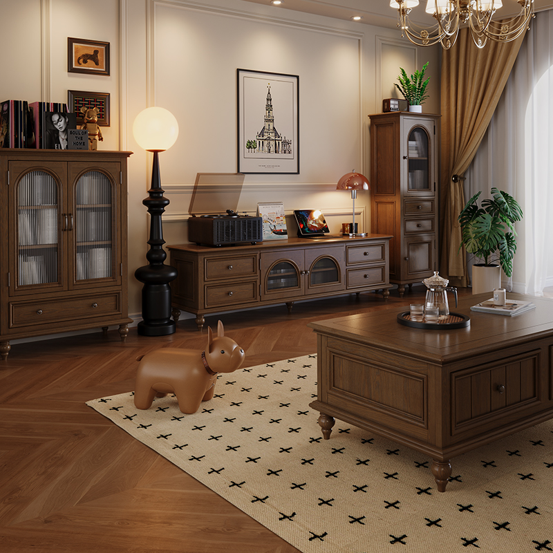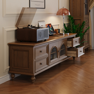 思必好法式 复古风实木电视柜组合茶几客厅中古靠墙落地收纳储物柜