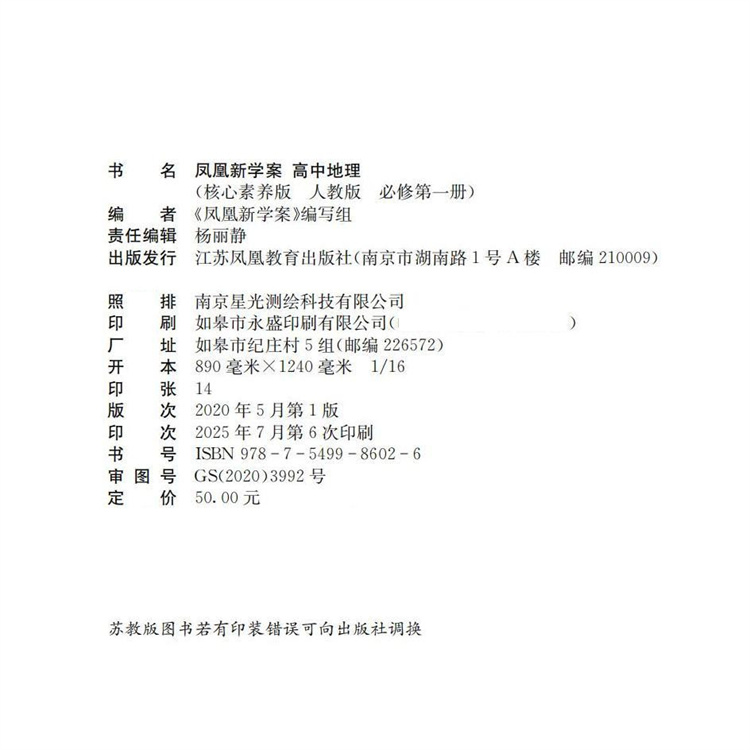 高中生用书 社 高中地理 江苏凤凰教育出版 核心素养版 学生用书 第1册 必修第一册 人教版 凤凰新学案 2025年