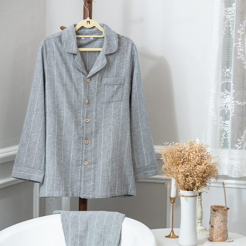三枪纯棉睡衣男女条纹翻领长袖 情侣家居服81697舒适贴身柔软 长裤