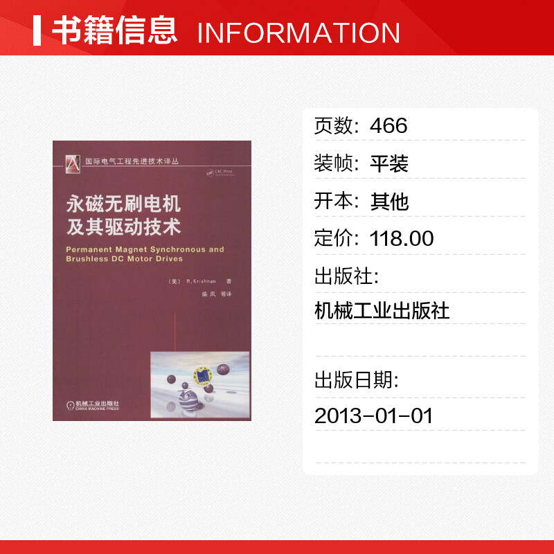 图书籍 社 著 译 电子电路专业科技 等 克里斯南 柴凤 机械工业出版 永磁无刷电机及其驱动技术 新华书店正版 美