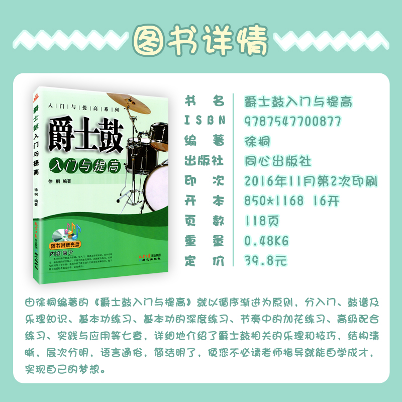 爵士鼓入门与提高赠光盘入门与提高系列徐桐著爵士鼓架子鼓初级入门自学教材音乐教材练习曲谱书籍