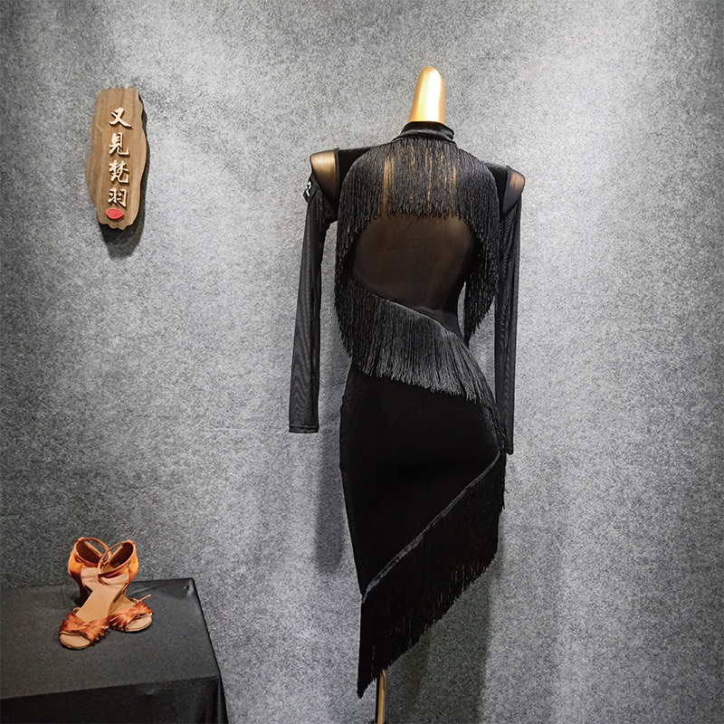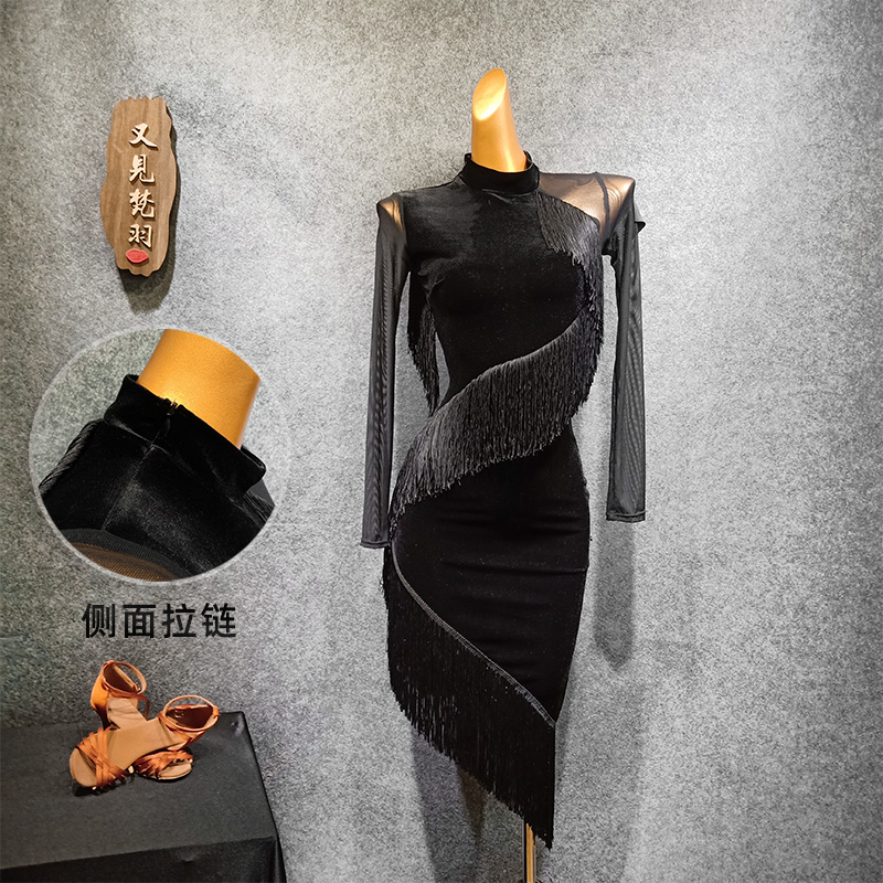 又见梵羽拉丁舞蹈服女成人练功服长袖 丝绒连衣裙拼接流苏裙LW407